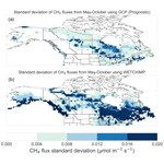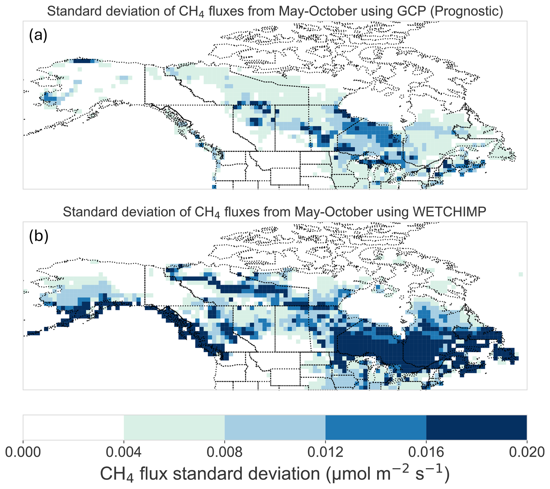We also find that the CH4 fluxes estimated by the 11 prognostic GCP models result in much lower inter-model uncertainty compared to the seven WETCHIMP models, with smaller inter-model disagreement across Canada and southern Alaska. Here, we define the uncertainty among models as the standard deviation across the models of the mean wetland flux CH4 in May–October. To evaluate model agreement on the spatial distribution of fluxes, we compare the inter-model uncertainty or the standard deviation of flux estimates for each individual model grid box of the GCP and WETCHIMP models. Since each WETCHIMP model identifies the inundation or wetland area differently, we compare these models with the prognostic GCP models (Melton et al.2013). Note, however, that not all of the WETCHIMP modeling groups generated their own wetland or inundation maps prognostically, and some, like LPJ-Bern and LPJ-WHyMe, use a constant, prescribed wetland map. In Fig. 3, darker shades represent higher inter-model uncertainty across these process-based models. We observe that the GCP models have much lighter shades across the study domain, indicating better inter-model agreement.