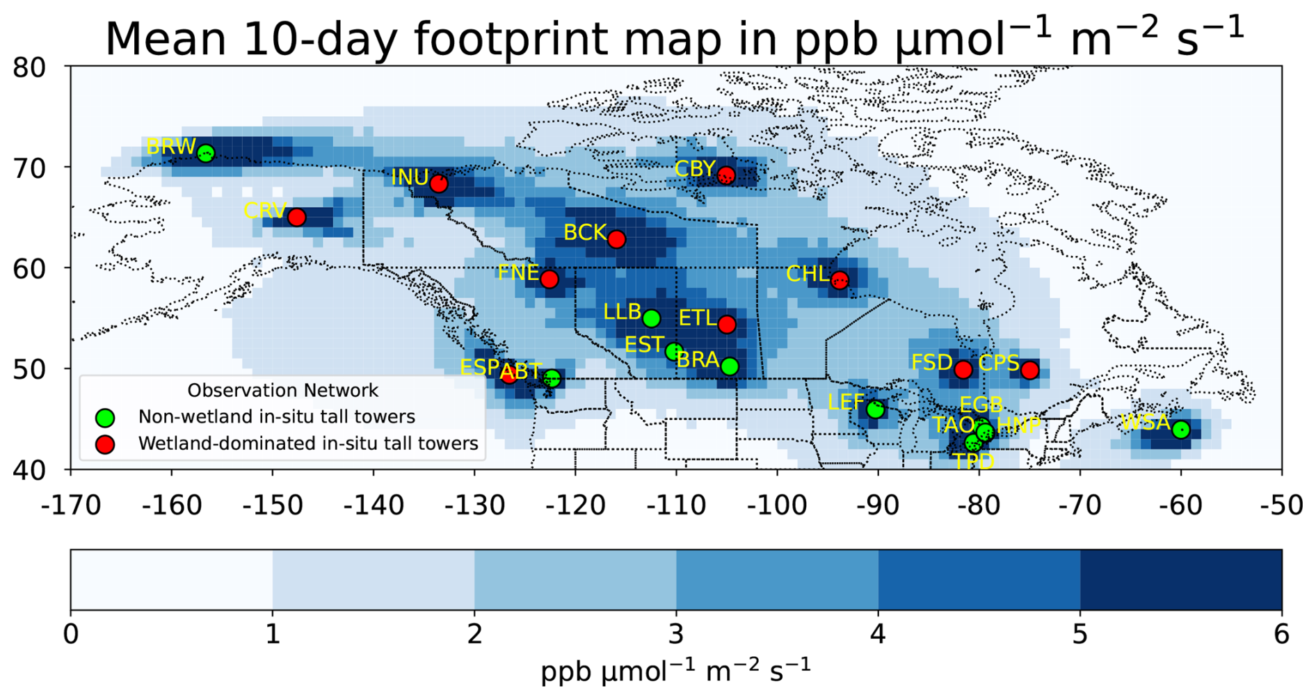 Figure 1The US and Canadian atmospheric CH4 observing network from 2007–2017. The figure also shows the WRF-STILT mean 10 d footprint map in ppb(µmolm-2s-1)-1 across the study domain of 40 to 80° N and 170 to 50° W, and footprints are evaluated from 2007–2017. Red circle dots show in situ tall tower sites from NOAA and Environmental Canada from the ObsPack GlobalViewPlus v5.1 dataset (Di Sarra et al.2023). The lime-colored dots represent non-wetland sites, where the wetland-to-anthropogenic CH4 concentration ratio is less than 1.3 (using anthropogenic emissions from the CAMS product). In contrast, the red-colored dots indicate wetland-dominated sites, where this ratio exceeds 1.3.