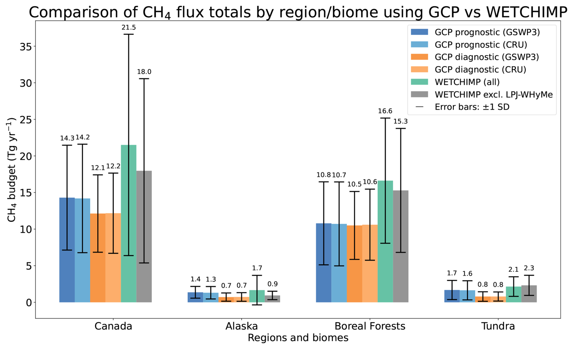 Note that the GCP models show lower flux magnitude and reduced inter-model spread in Canada, even when using the subset of models that are common to both WETCHIMP and GCP. For diagnostic GCP runs, the overlapping model subsets with WETCHIMP are LPX-Bern (a newer version of LPJ-Bern), DLEM, ORCHIDEE, LPJ-wsl, SDGVM. For prognostic GCP runs, the common models include LPX-Bern, ORCHIDEE, LPJ-wsl, and SDGVM. Using these shared models, we find that the mean annual flux total from the WETCHIMP models is roughly 4 Tg CH4 yr−1 higher than the matched GCP ensemble mean, whereas in Alaska WETCHIMP is 0.11 Tg CH4 lower (Figs. S5 and S6). In addition, we also find that the GCP ensemble exhibits lower inter-model spread in Canada and broadly similar or lower spread in Alaska (Fig. S9). As a result, these analyses lead to the conclusion that the GCP ensemble is more tightly constrained than WETCHIMP over Canada when the same models are compared.