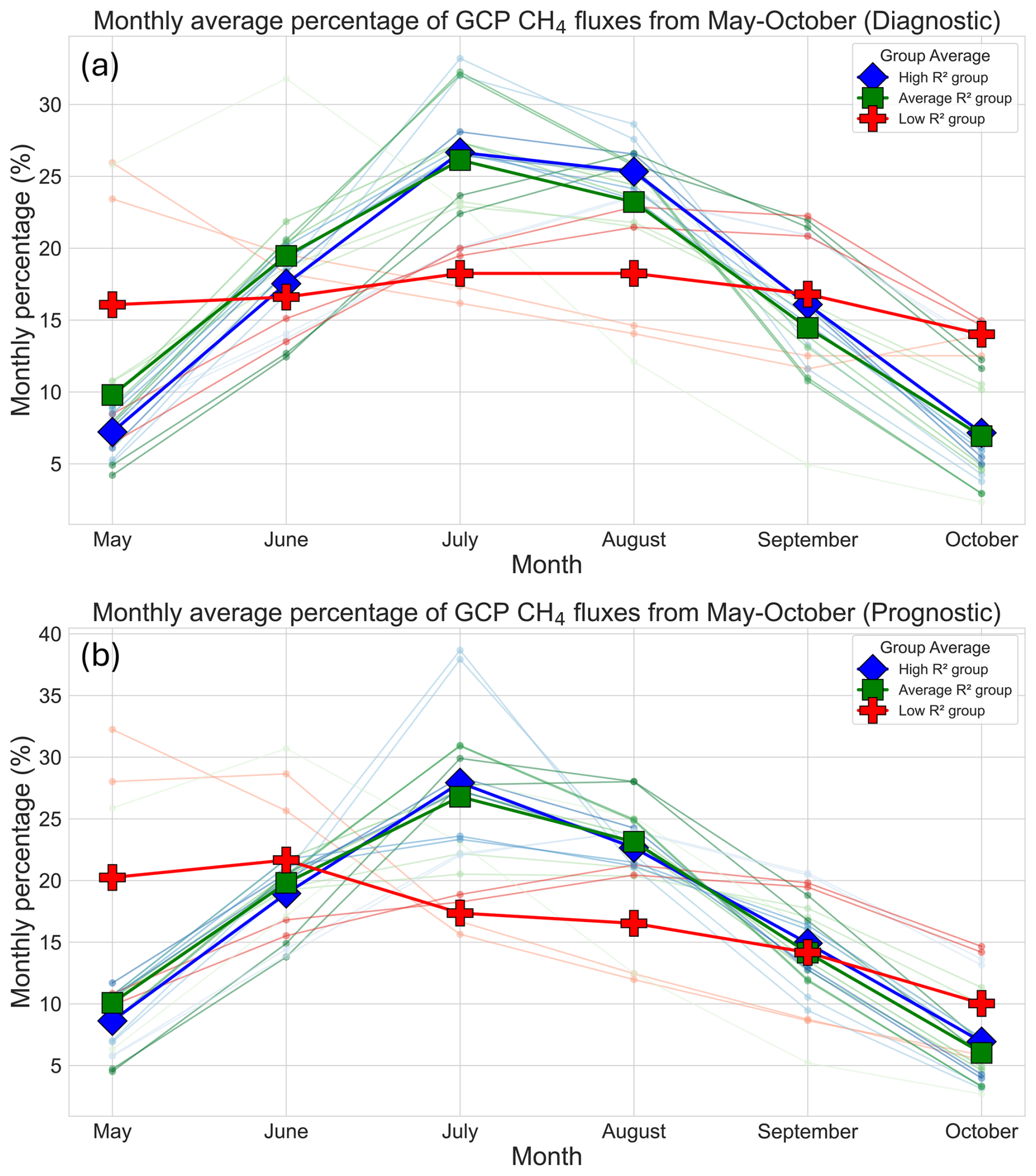 Figure 6The seasonal cycles of the diagnostic GCP models (a) and prognostic GCP models (b) from 2007–2017. The blue, green, and red lines each represent the GCP models that have the highest, average, low R2 values with atmospheric observations. The x axis represents the months from May to October throughout 2007–2017, and y axis denotes the percentages of CH4 fluxes that occur within that month.