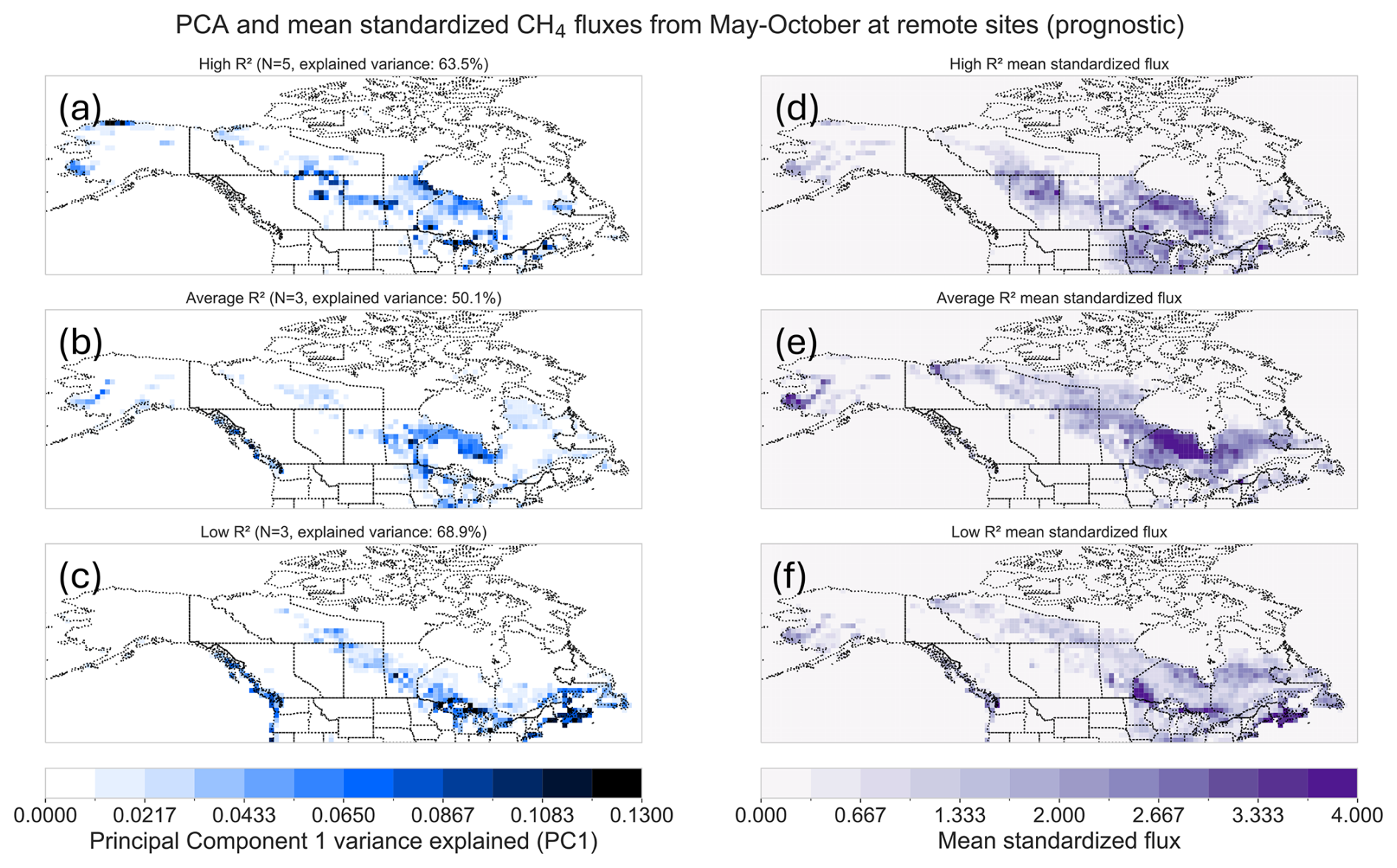An important caveat of this result is that the long-term observation network is sensitive to fluxes from some regions of high-latitude North America but not others (Fig. 1). The PCA analysis itself is unweighted, and our interpretation of spatial patterns (based on the R2 metric) is necessarily influenced by regions with stronger observational coverage. We also note that none of the atmospheric observing towers are directly located in the Hudson Bay Lowlands, but the STILT footprints shown in Fig. 1 indicates that the network is sensitive to CH4 fluxes from the broader region, allowing us to draw conclusions about the spatial distribution of fluxes in and around the Hudson Bay Lowlands.