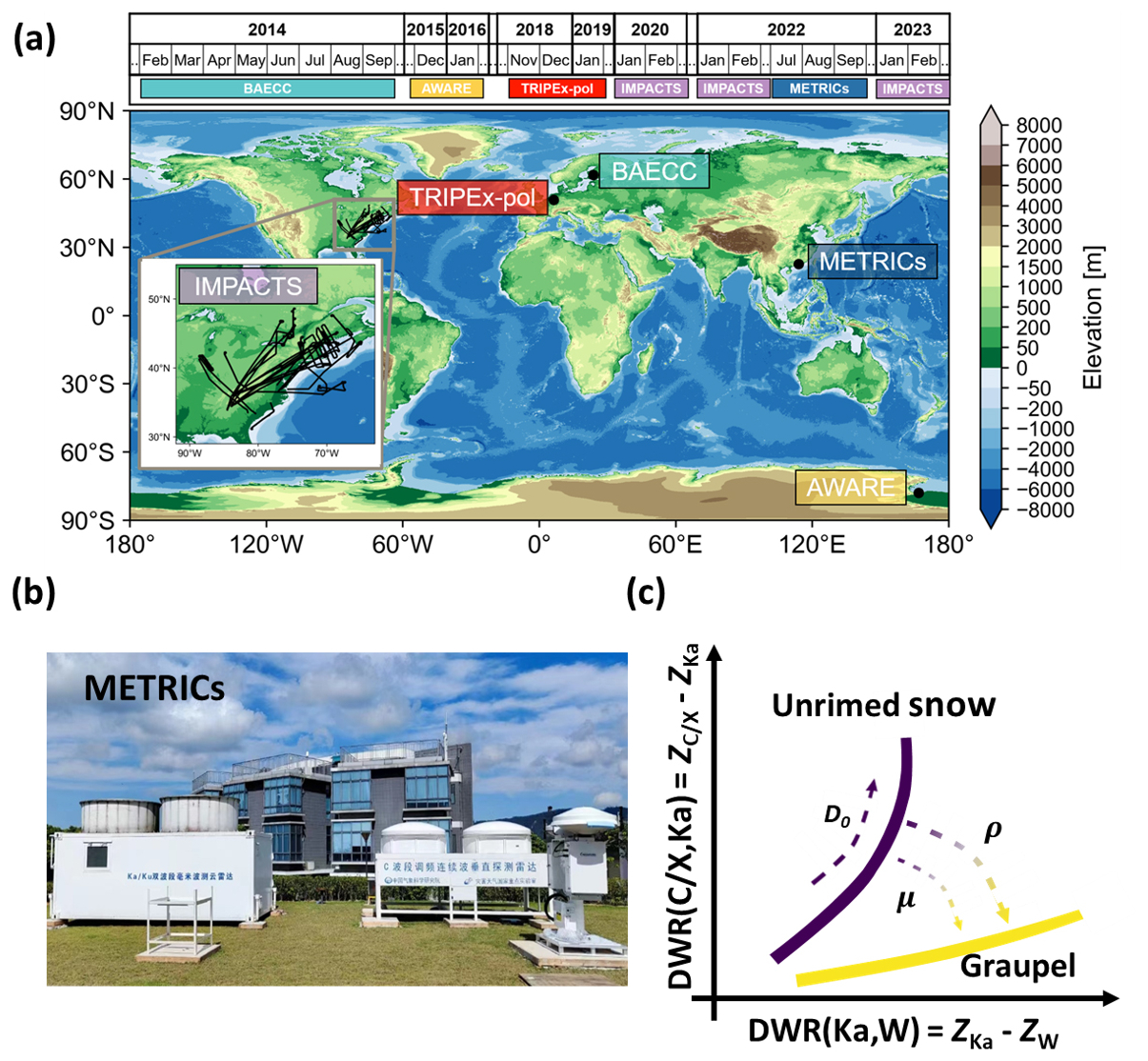 Figure 1(a) Overview of the triple-frequency radar field campaigns. (b) C/Ku/Ka/W-band radars in METRICs. (c) Triple-frequency signatures of physical parameters of snowflakes. D0, ρ, and μ denote median volume diameter, snow density, and the shape parameter of the Gamma size distribution, respectively. Since the average value of μ is around 0 (Brandes et al., 2007; Heymsfield et al., 2008; Tiira et al., 2016), our interpretation of triple-frequency statistics bears the assumption of μ=0, namely the exponential distribution. The BAECC, AWARE and IMPACTS