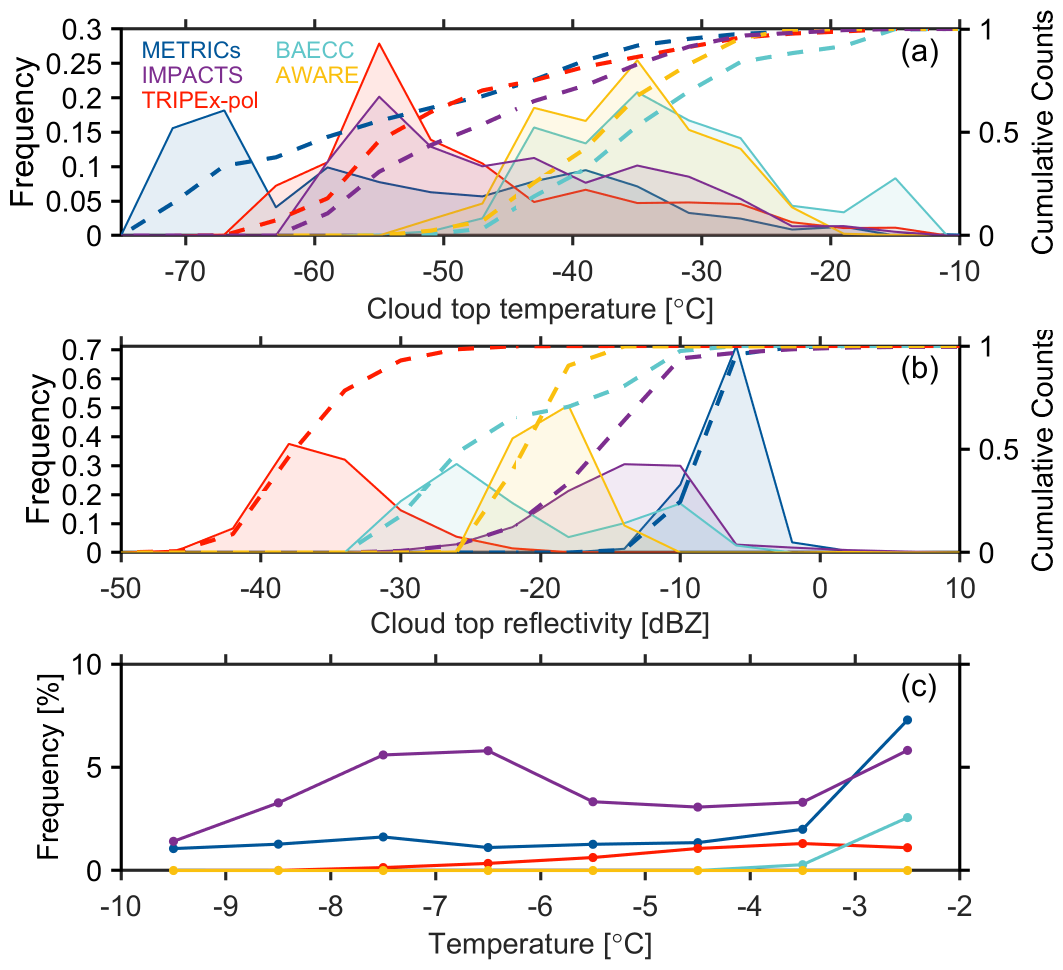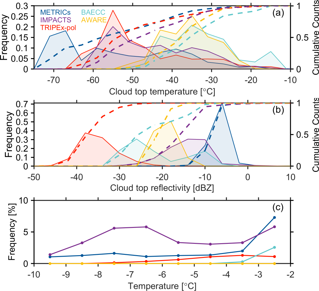 Ice formation at the cloud top is essential for later snow growth processes. We have compared the cloud top temperature (CTT) observations in the five campaigns as shown in Fig. 2. The cloud top was determined using the highest radar echo as mostly detected by the Ka band radar. In METRICs, the thick rain layer leads to decent attenuation at Ka-band and the C-band radar occasionally observed the highest cloud top (Li et al., 2025). In presence of multi-layer clouds, we have removed upper clouds with a radar echo gap exceeding 2 km for excluding the impact of seeding (Seifert et al., 2009; Li et al., 2021). As shown in Fig. 2a, clouds over tropics are characterized by the coldest tops, while cloud tops over high-latitudes are shallower and warmer, which are in line with Cloudsat observations (Sassen and Wang, 2008). Note that due to the degradation of C-band radar sensitivity with range, the cloud top radar reflectivity in METRICs is of the magnitude of −10 to 0 dBZ, suggesting that the actual cloud top temperatures were even colder.