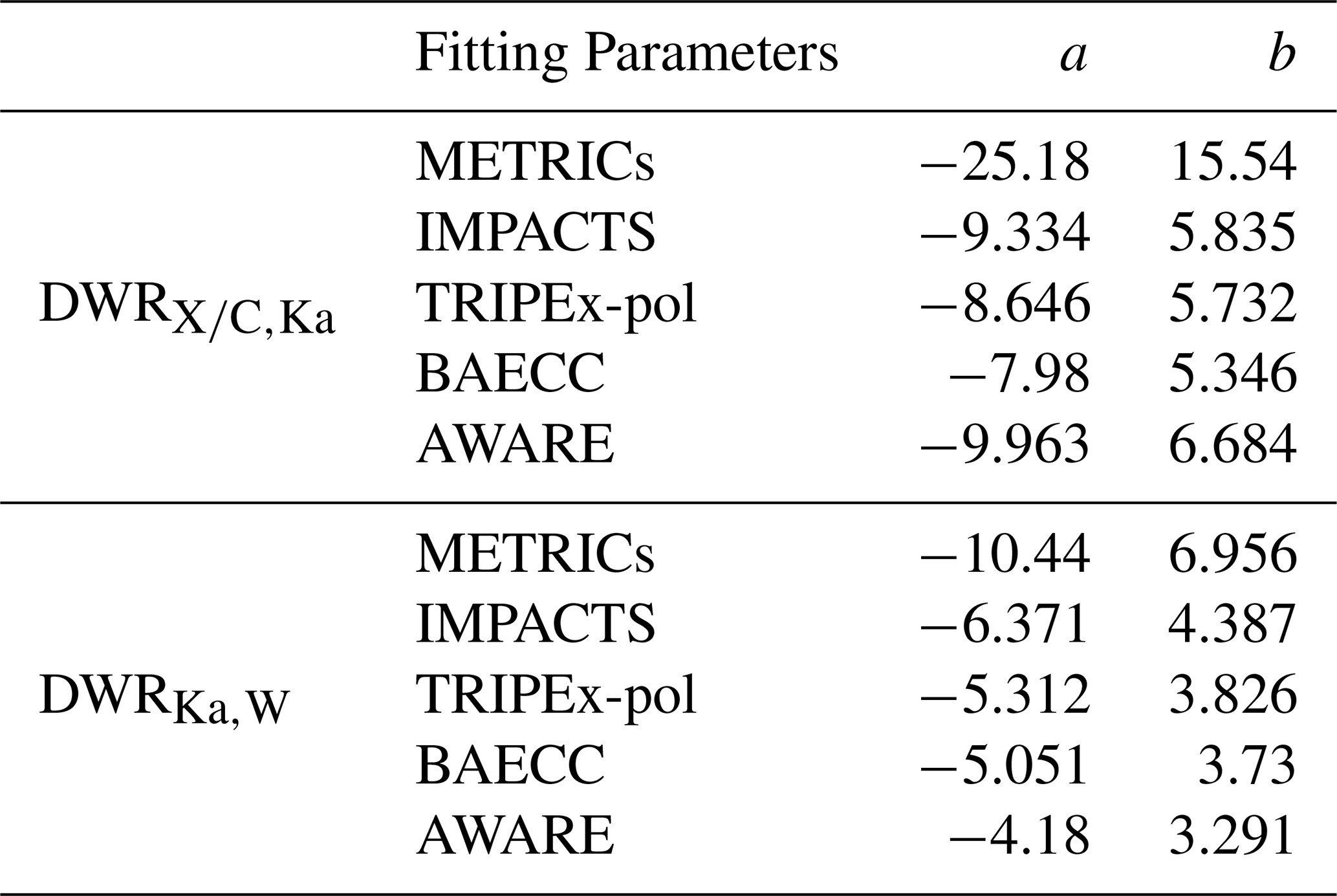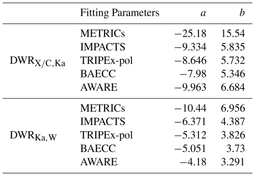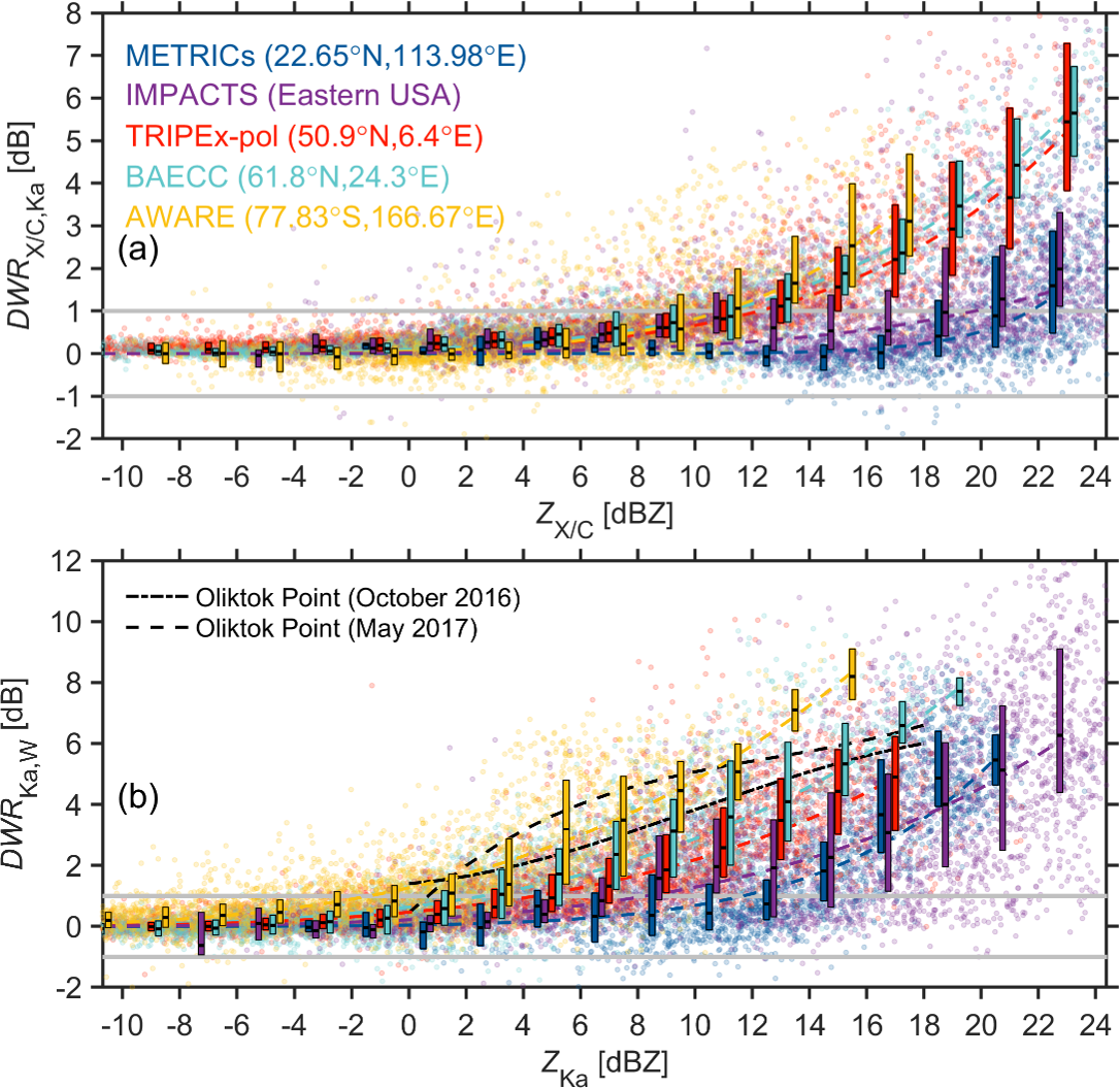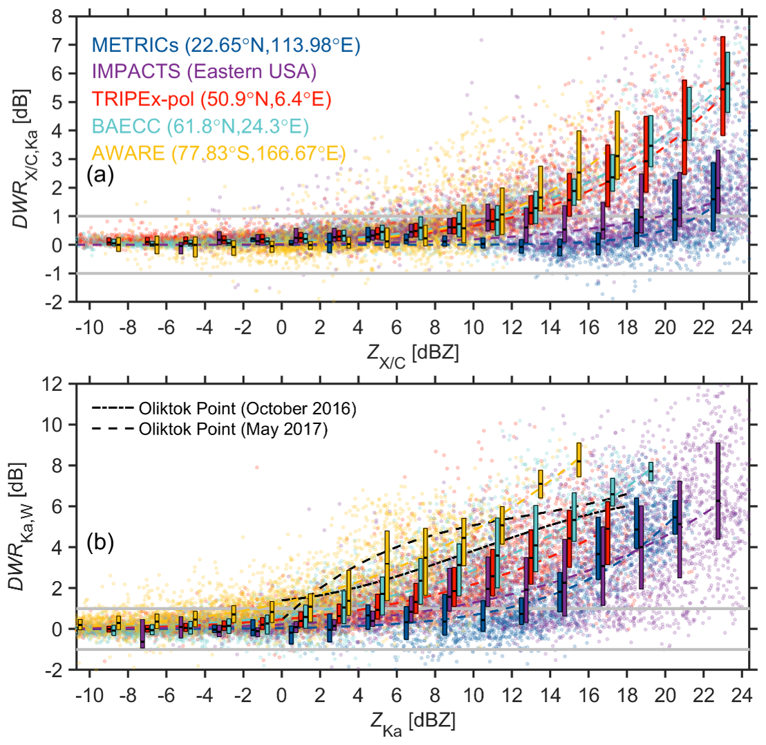 We examine stratiform precipitation (rainfall with bright band signatures and snowfall, cloud cases were removed for minimizing the impact of sublimation) with ground-based/airborne multi-frequency radars in five field campaigns. Namely, the Biogenic Aerosols-Effects on Clouds and Climate campaign (BAECC, Petäjä et al., 2016), TRIple frequency and Polarimetric radar Experiment for improving process observation of winter precipitation (TRIPEx-pol, Dias Neto et al., 2019; von Terzi et al., 2022), the Atmospheric Radiation Measurements West Antarctic Radiation Experiment (AWARE, Lubin et al., 2020), Investigation of Microphysics and Precipitation for Atlantic Coast-Threatening Snowstorms (IMPACTS, McMurdie et al., 2022), and the Multi-frequency radar Experiment for TRopical Ice Clouds (METRICs). As shown in Fig. 1a, these campaigns were conducted over various latitudes, ranging from tropical (METRICs), mid-latitude (IMPACTS, TRIPEx-pol), high-latitude (BAECC) to polar (AWARE) regions. Note that the X/Ka/W-band setups were employed in IMPACTS, TRIPEx-pol, BAECC and AWARE, and C/Ka/W-band radars were used in METRICs. For simplicity, we use to refer X- (IMPACTS, TRIPEx-pol, BAECC, and AWARE) or C-band (METRICs) reflectivity. Similarly, DWR denotes the dual-wavelength ratio between X- or C-band reflectivity and Ka-band reflectivity.