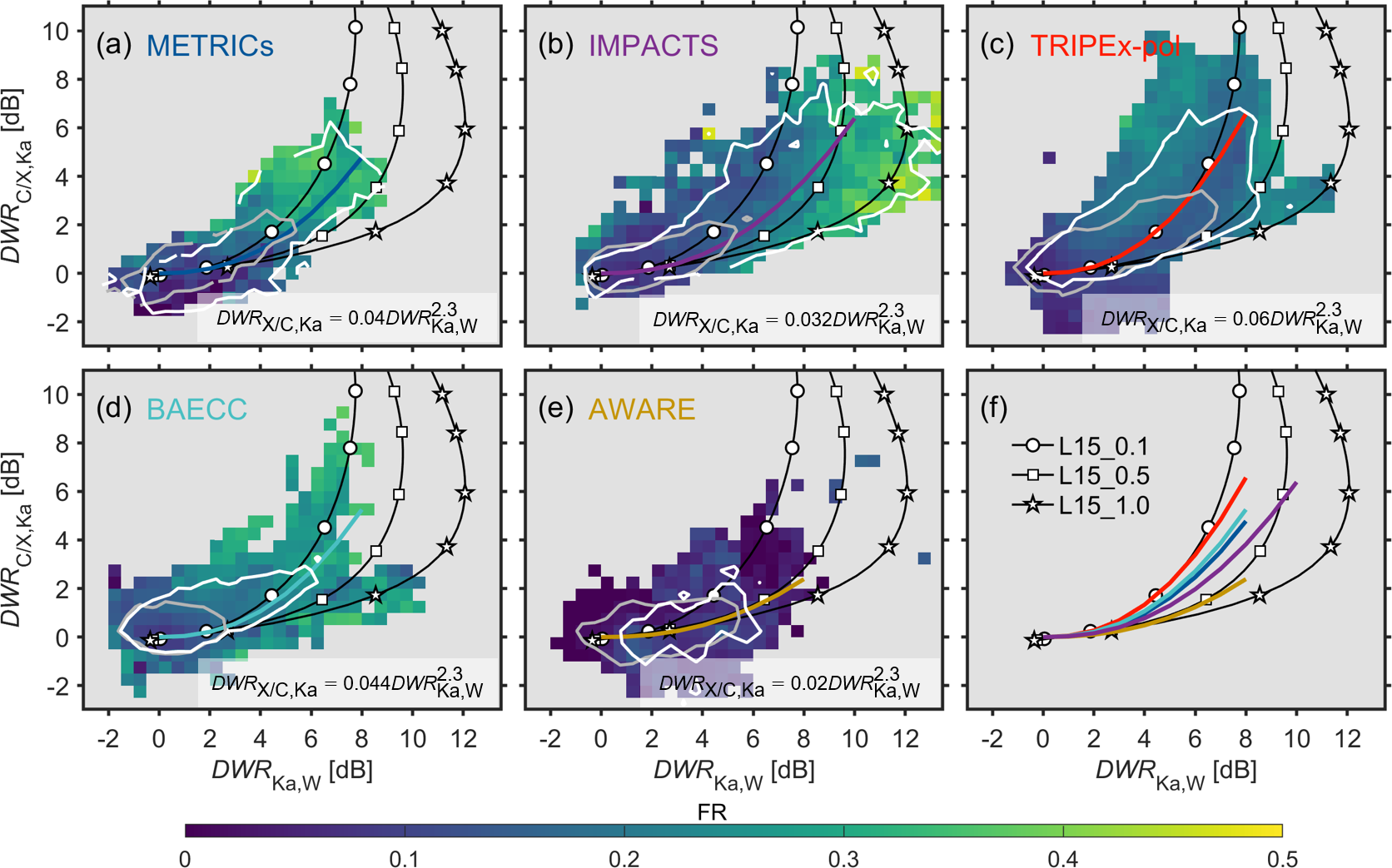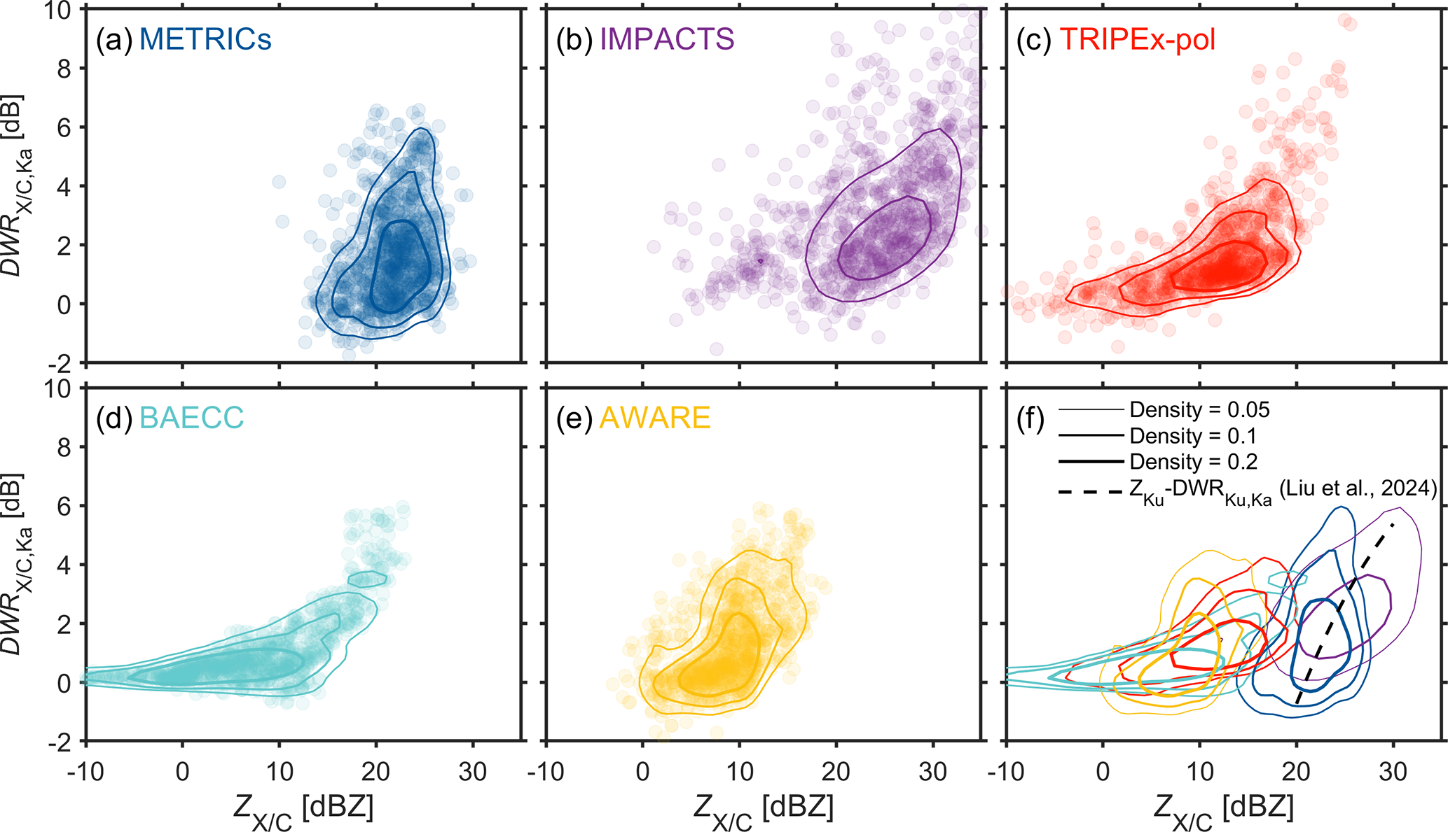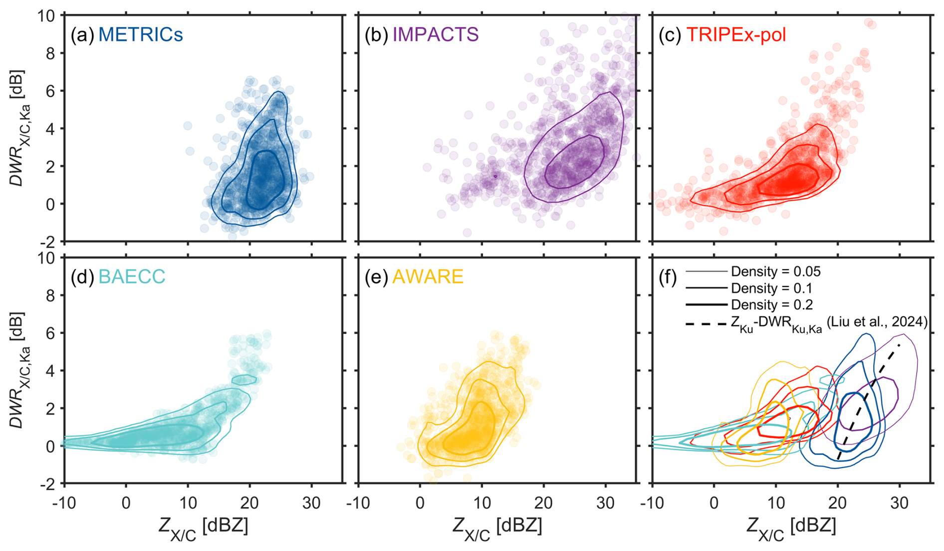 Figure 5Observed DWR (circles) as a function of at temperatures greater than −8 °C in (a) METRICs, (b) IMPACTS, (c) TRIPEx-pol, (d) BAECC, and (e) AWARE. The colored isolines represent the observation density distributions for each field campaign. In (f), the black dashed curve marks the fit for FY-3G Ku and Ka band radar observations of snow over the melting layer of low- to mid-latitude stratiform rainfall (Liu et al., 2024).