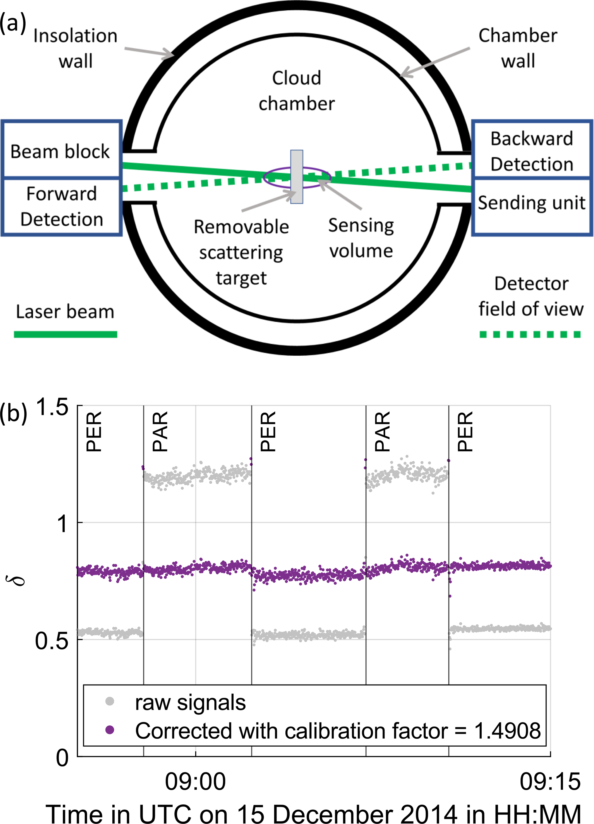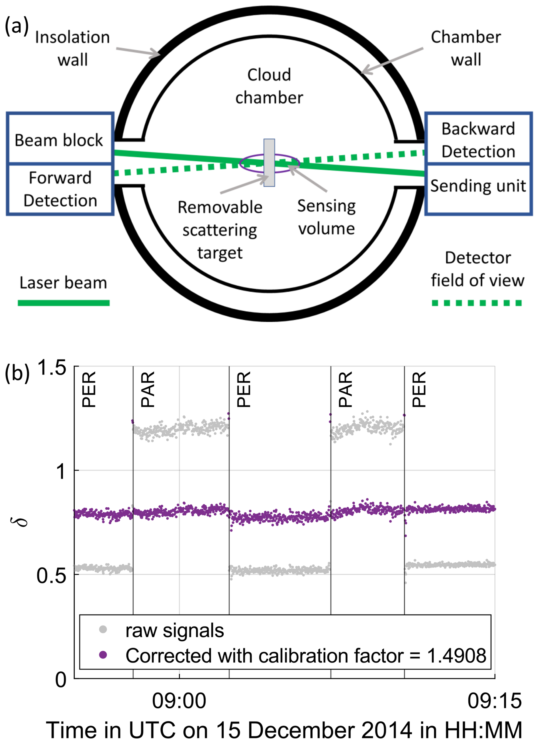Figure 1Schematic setup of the SIMONE instrument in top view (a) and calibration process of SIMONE-Junior for the RICE03 campaign with a scattering target inside the sensing volume (b). PAR refers to incident polarisation parallel to the scattering plane and PER refers to linear polarisation perpendicular to the scattering plane. The calibration factor is determined using the linear depolarisation ratio of the scattering target which is independent of the polarisation direction of the incident light.