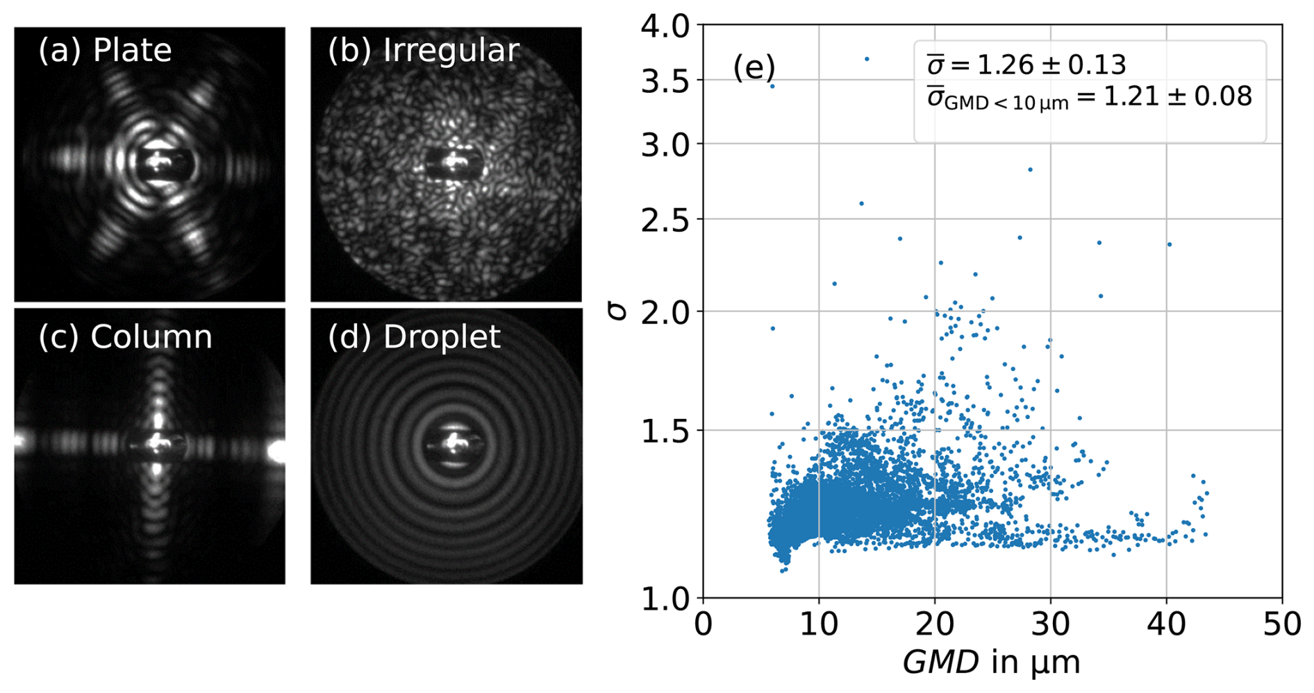 Figure 2Example diffraction patterns of PPD-2K from the RICE01 campaign are shown for a plate (a), an irregular particle (b) a column (c) and a sphere (droplet) (d). The standard deviation σ of the logarithm of the particle diameter is shown as a function of geometric mean diameter (GMD) for log-normal fits to the particle size distributions at temperatures below −39 °C (e).