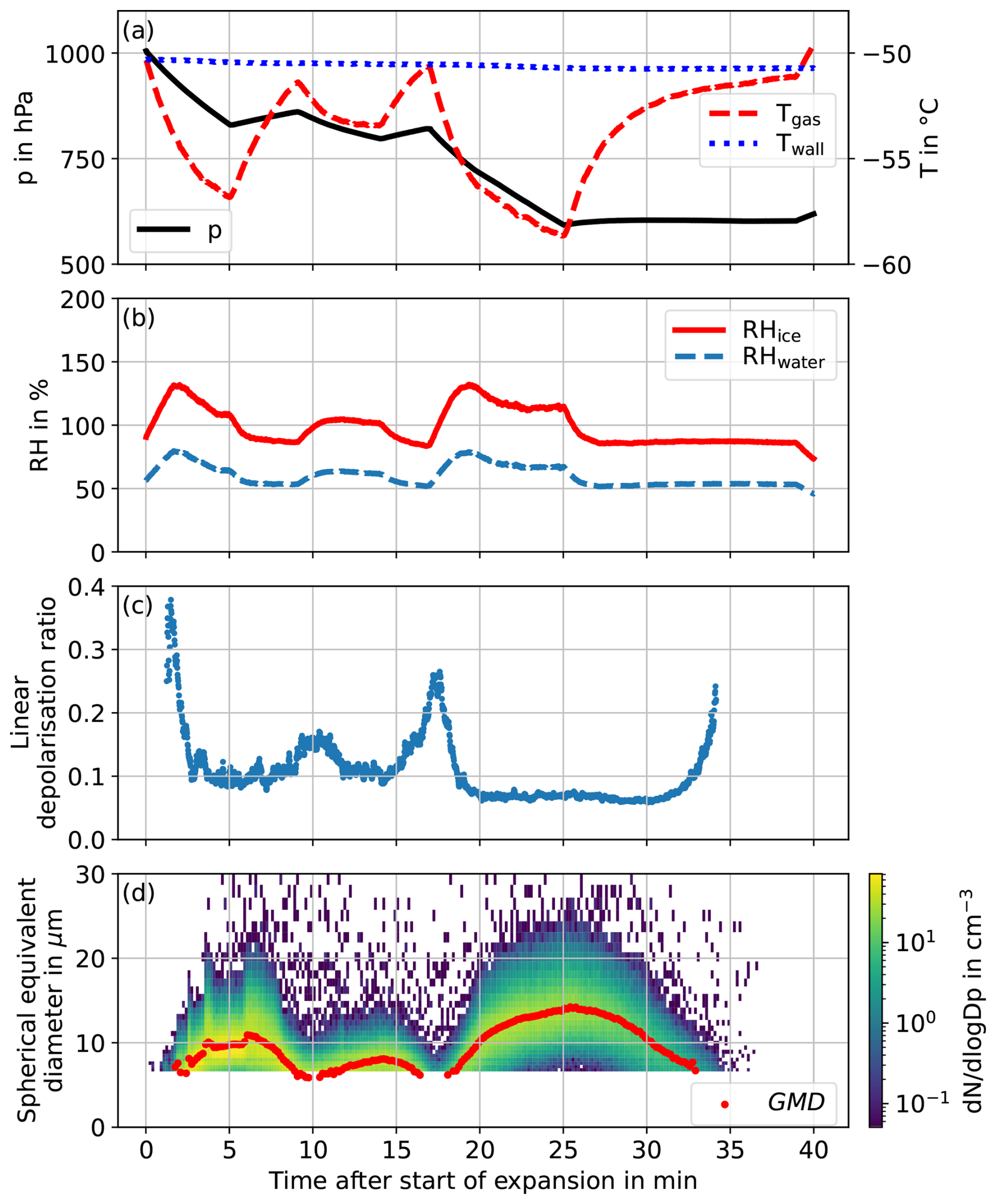 Figure 3Example expansion experiment 06 from the RICE02 campaign. Initial growth, sublimation and two regrowth cycles can be seen. The gas pressure p, gas temperature Tgas and wall temperature Twall inside the cloud chamber (a), the relative humidity with respect to water RHwater and ice RHice (b), the linear depolarisation ratio δ from SIMONE (c) and the geometric mean diameter (GMD) derived from from PPD-2K (d) are shown as a function of time after the start of the experiment.