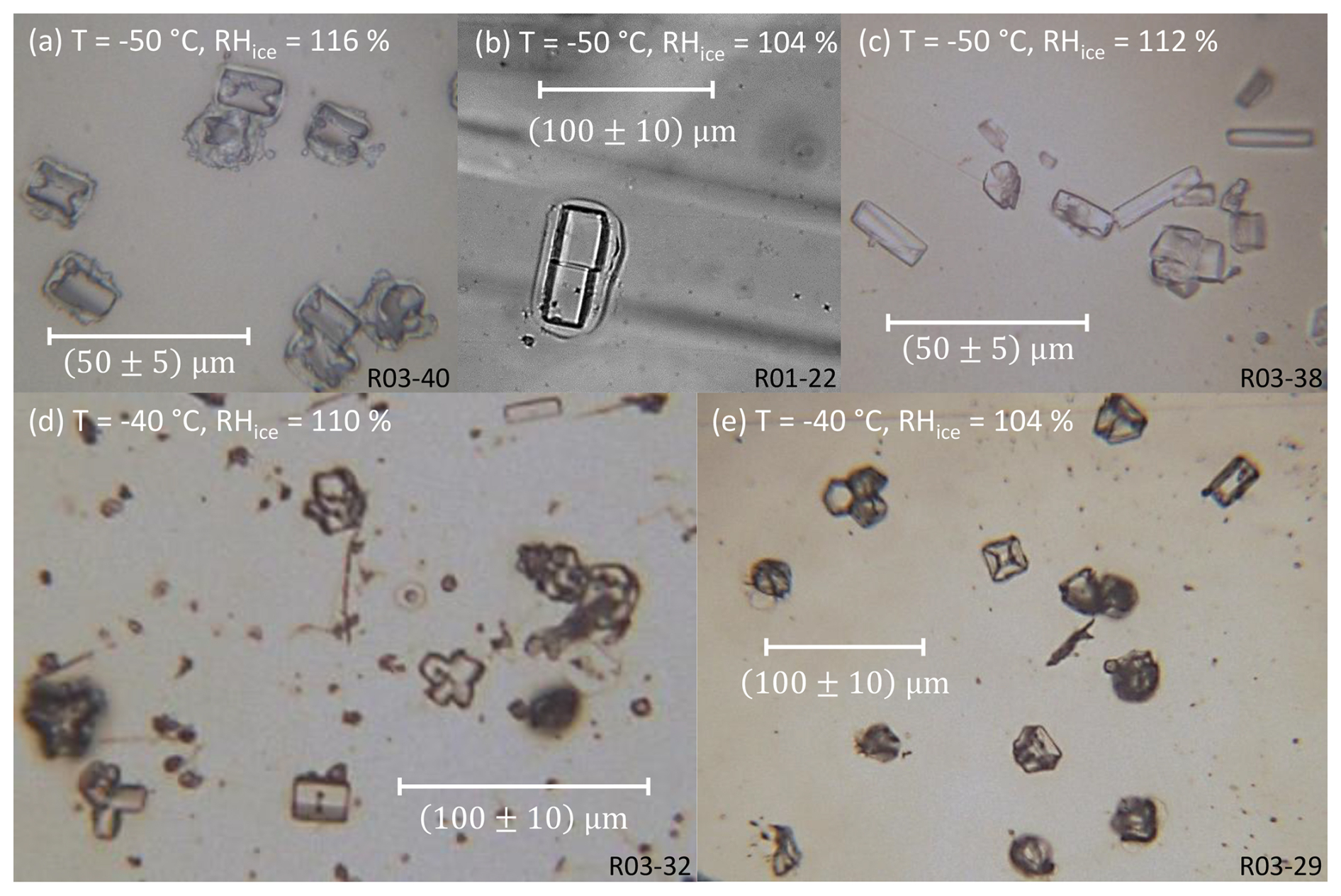 Figure 5Microscopic images of example formvar replicas of cloud chamber grown ice crystals highlighting different ice crystal complexities. The ice particles were grown at temperatures of −40 and −50 °C and relative humidity between 104 % and 116 %. R03-30 stands for experiment 30 of measurement campaign RICE03. The hexagonal ice crystals in (a) show hollowness on the basal facets and occasionally have air inclusions and the ice crystal in (b) has a central dislocation. (c, e) show columnar and irregularly shaped ice crystals and in (d) budding rosettes can be seen.