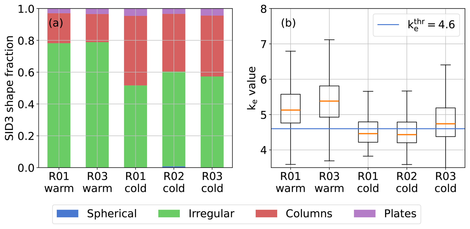 Figure 6Particle shape fractions that are determined from all forward scattering images taken with the SID-3 instrument during the different campaigns (a). Each campaign is divided into two different groups. Cold refers to AIDA initial gas temperatures between −75 and −45 °C and warm to temperatures between −45 and −39 °C. In (b) ke is plotted over the different campaigns. kethr is the threshold of 4.6 for morphologically complex ice crystals defined by Schnaiter et al. (2016). More complex ice particles are observed for the higher cirrus temperatures.