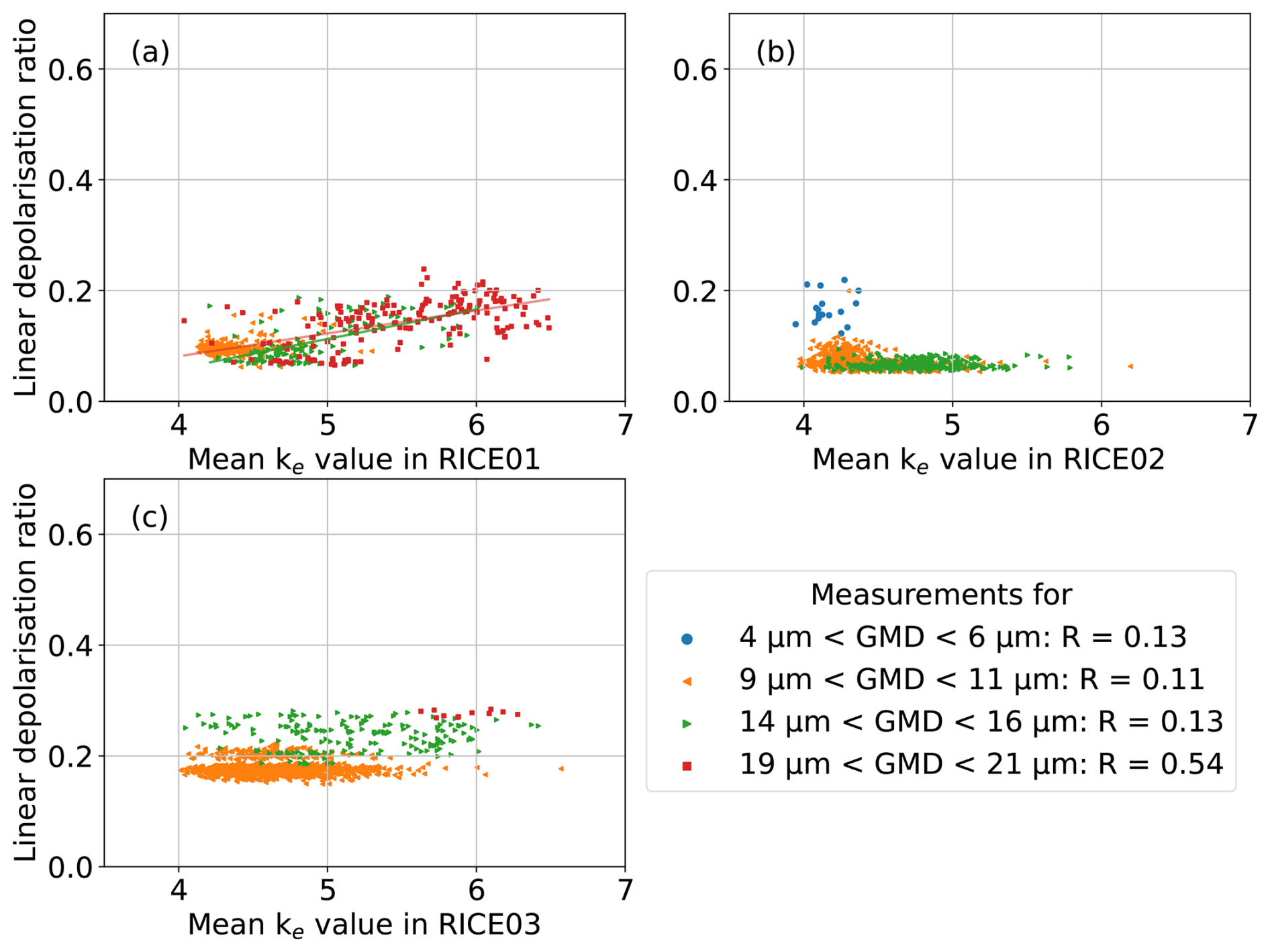 Figure 8Linear depolarisation ratio as a function of optical particle complexity ke measured with the SID-3 instrument for the RICE01 campaign (a), for the RICE02 campaign (b) and for the RICE03 campaign (c) with linear fits to the data. Only a weak to moderate correlation is observed.