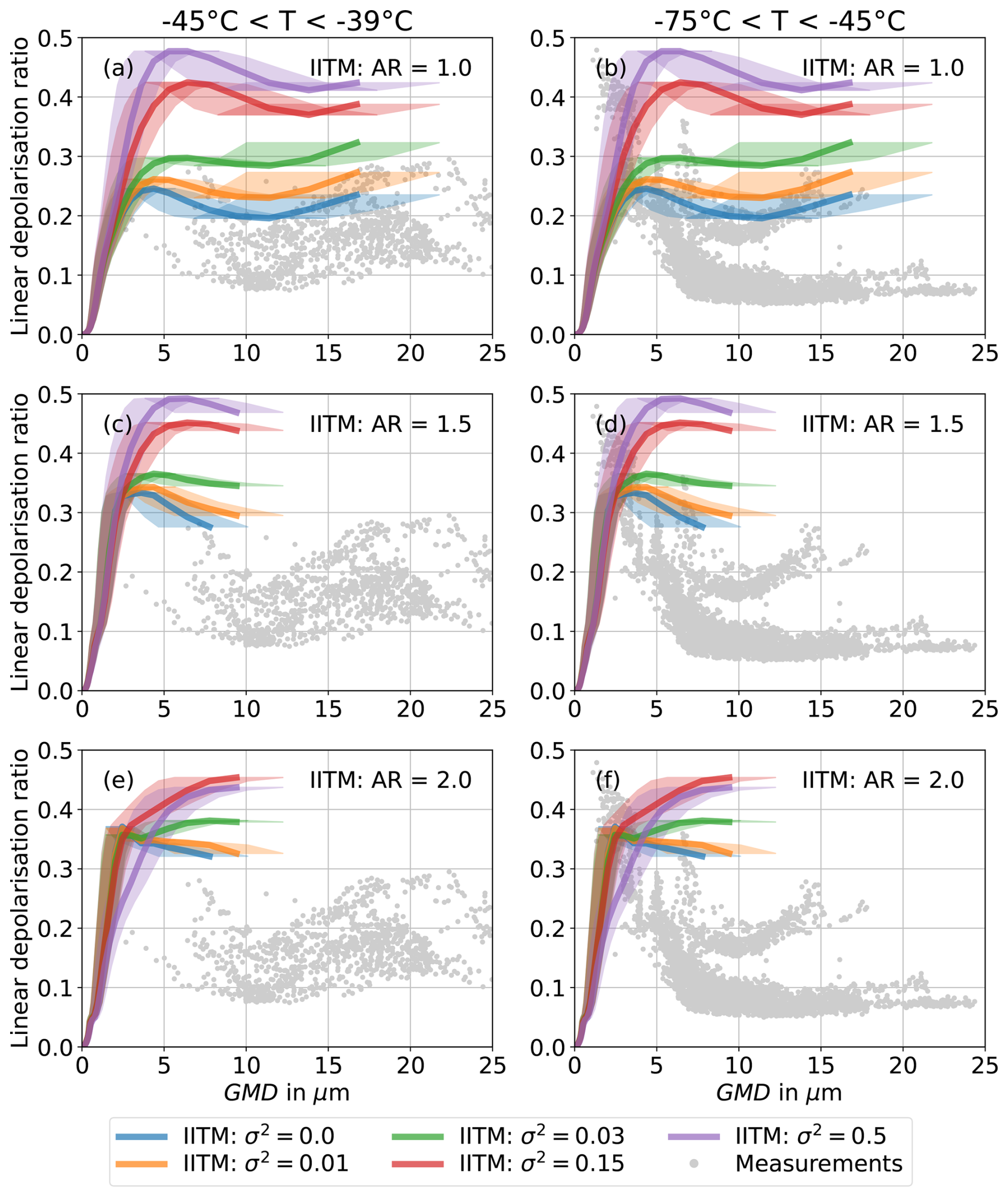 Figure B3Linear depolarisation ratio as a function of geometric mean diameter (GMD). The measurement data (dots) are compared to T-matrix simulations of spheroidal particles at 178° near-backscattering direction (lines) (Leinonen2014) and to CGOM simulations of columns with a distortion of 0.3. The aspect ratio (AR) is varied between 1.5 and 2.0. Mean free paths of 150 µm (high internal scattering) and 104 µm (negligible internal scattering) are used for solid columns (see A and B), and a mean free path of 2000 µm is used for solid columns (see C). For comparison (a) includes all measurements with initial gas temperatures between −45 and −39 °C and (b) between −75 and −45°C as gray dots. The shaded areas mark the uncertainty in size conversion between the measurement data and the simulations. Changes in aspect ratio in the observed range between 1.5 and 2.0 only cause minor changes in δ.