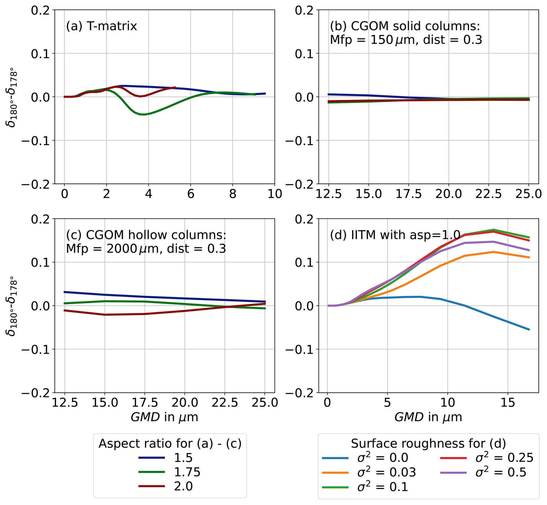 However, the applicability of these numerical results produced with idealized crystal geometry to atmospheric remote sensing observations is highly uncertain because recent studies have observed that cirrus ice crystals rarely show idealized hexagonal shape and almost always contain some degree of morphological complexity (Järvinen et al.2023). Saito and Yang (2023) used the Invariant Imbedding T-Matrix (IITM) and the improved geometric optics method (IGOM) to model the effects of both size and surface roughness on the linear depolarisation ratio of hexagonal ice crystals with an aspect ratio of one. They concluded that the ice crystal roughness has a strong impact on the backscattering properties, which needs to be included in order to simulate observational data. Adding hollowness to the basal facets of bullet rosette ice crystals was found to lower the backscattering linear depolarisation ratio using improved geometric ray tracing simulations (Yang et al.2008). Furthermore, a decreasing trend in linear depolarisation ratio for increasing particle size was seen that was not present for solid bullet rosettes.