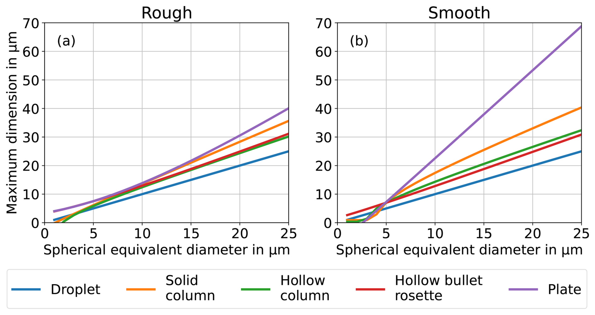 The conversion between the particle sizes from the numerical simulations and the spherical equivalent diameter measured with PPD-2K is non-trivial and therefore an approximation is needed. In this work, we use the maximum dimension of the spheroidal particles and the column length of the hexagonal particles, which is common approach when analysing the optical properties of ice particles (Liu et al.2014). To estimate possible errors, the spherical equivalent diameter measured with PPD-2K is calculated for different complex shaped ice particles in Fig. A1. The maximum particle dimension can be up to 40 % larger than the spherical equivalent diameter for rough columnar and bullet rosette shaped ice particles. However, the column length of columnar particles can also be smaller than the maximum particle dimension, depending on its aspect ratio (Um et al.2015). For example, a columnar particle with an aspect ratio of 1.5 has a maximum dimension, which is about 30 % larger than its length. These uncertainties in size conversion are shaded in the figures where the results of the numerical simulations are compared to the measurements with PPD-2K.
