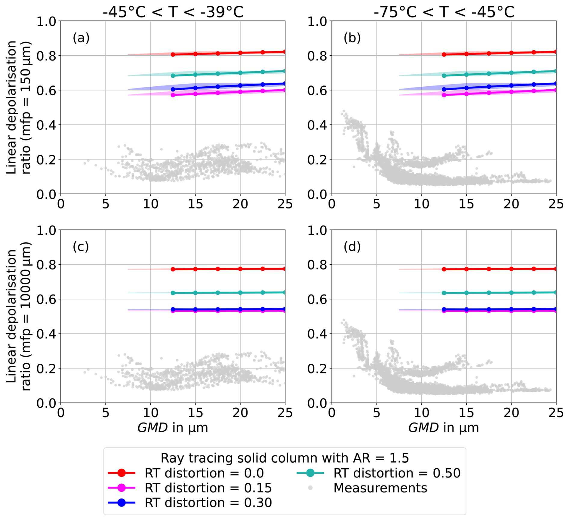 Figure B1Linear depolarisation ratio from CGOM simulations at 178° near-backscattering direction as a function of geometric mean diameter (GMD) for solid columns (Macke2020). The aspect ratio (AR) is fixed at 1.5 and the distortion is varied between 0 and 0.5. The simulations in (a) and (b) use a mean free path of 150 µm (c) and of 104 µm for high and negligible internal scattering, respectively (d). For comparison, (a) and (c) include all measurements with initial gas temperatures between −45 and −39 °C and (b) and (d) between −75 and −45 °C as gray dots. The shaded areas mark the uncertainty in size conversion between the measurement data and the simulations. δ simulated for solid columns overestimates the measurement data.