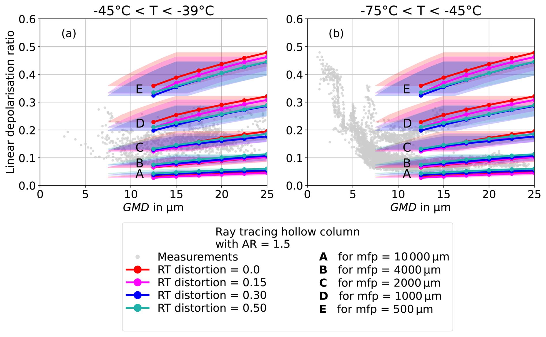 Figure B2Linear depolarisation ratio as a function of geometric mean diameter (GMD). The measurement data (dots) are compared CGOM simulations of columns with hollow basal facets (entering 33.3 % of the column height from each basal facet) using mean free paths between 104 µm (label A) and 500 µm (label E) (Macke2020). The experimental data at initial gas temperatures between −45 and −39 °C is shown in (a) and between −75 and −45 °C in (b). The shaded areas mark the uncertainty in size conversion between the measurement data and the simulations.