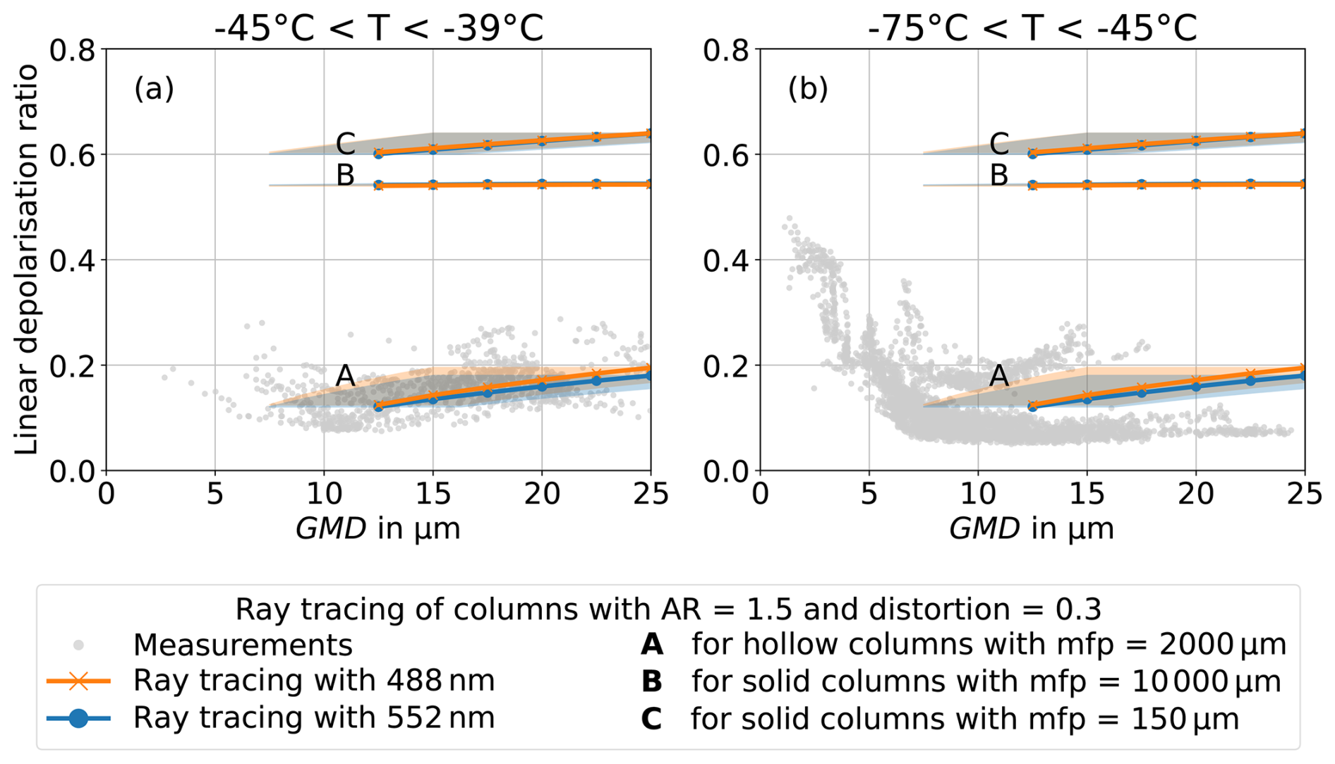 Figure B4Linear depolarisation ratio from CGOM simulations at 178° near-backscattering direction as a function of geometric mean diameter (GMD) for solid and hollow columns (Macke2020) and for wavelengths of 488 and 552 nm, as they are used by the SIMONE and SIMONE-Junior instruments, respectively. The aspect ratio (AR) is fixed at 1.5 and the distortion is fixed at 0.3. Mean free paths of 150 µm (high internal scattering) and 104 µm (negligible internal scattering) are used for solid columns (see C and B) and 2000 µm for hollow columns (see A). For comparison (a) includes all measurements with initial gas temperatures between −45 and −39 °C and (b) between −75 and −45 °C as gray dots. The shaded areas mark the uncertainty in size conversion between the measurement data and the simulations. Small changes in the used wavelength of the two instruments only cause minor changes in δ according to the CGOM simulations.