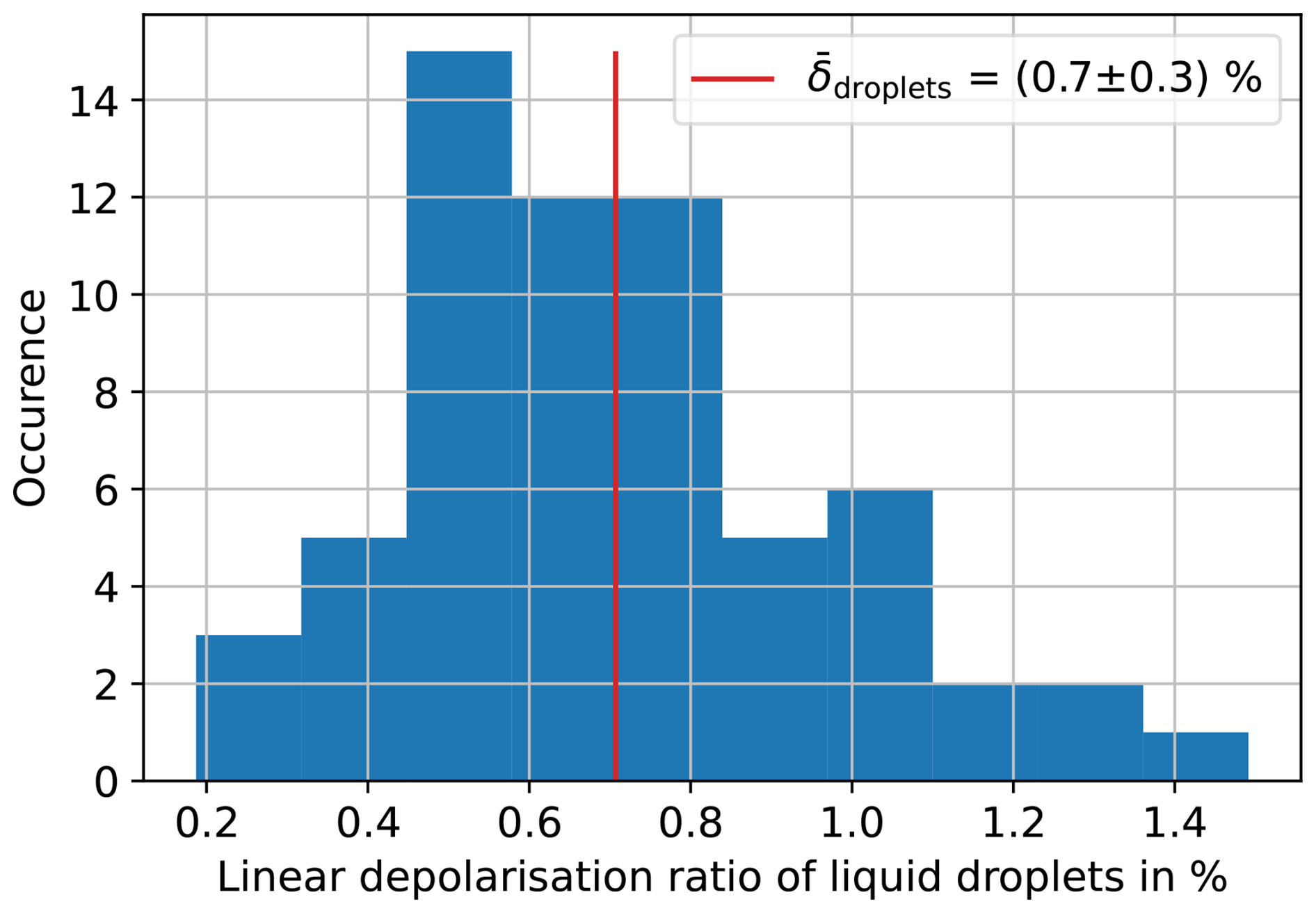 Figure B5Histogram of the 10 s averaged linear depolarisation ratio measured during 12 supercooled liquid droplet cloud experiments in the AIDA cloud chamber during the RICE03 campaign at an initial gas temperature of −30 °C. The observed mean linear depolarisation ratio (δdroplet) is (0.7±0.3) %, which is well within the expected range taking the measurement uncertainty of 2.1 % from the calibration target measurements into consideration.