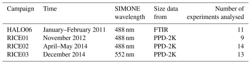 The particle size, shape and small-scale morphological complexity are optically characterised using the Particle Phase Discriminator 2 Karlsruhe edition (PPD-2K) and the Small Ice Detector 3 (SID-3) (Kaye et al.2008; Ulanowski et al.2014; Vochezer et al.2016; Schnaiter et al.2016). Both instruments are optical particle counters that detect the scattered light of individual particles. A sample air flow passes the measurement volume that is defined by the overlap between the laser beam with a wavelength of 532 nm from a frequency-doubled Nd:YAG laser and the field of view of the trigger optics. The design of the trigger optics differs in both instruments. In PPD-2K, a beam splitter diverts 8 % of the forward scattering light to the trigger detector. SID-3 uses two nested trigger detectors with half angles of 9.25° at an angle of 50° to the forward scattering direction. In both instruments, the trigger intensity is detected with a photomultiplier tube and used to determine the size of the individual particles with a maximum count rate of 11 kHz. A special feature of SID-3 and PPD-2K is that they use an intensified Photek ICCD218 camera to record the spatial intensity distribution of the forward scattered light over an annulus between approximately 5° and 26° with a resolution of 780 pixels×592 pixels (SID-3) and between 7.4° and 25.6° with a resolution of 582 pixels×592 pixels (PPD-2K). Images are taken for a subset of the triggered particle events due to the camera's maximum imaging rate of 30 Hz. These diffraction patterns contain information on the particle habit and morphological complexity at scales of the wavelength of the used light. Both instruments were operated simultaneously. Here we use PPD-2K for getting the size information due to higher counting statistics compared to SID-3 (Vochezer et al.2016) and SID-3 for getting information on the crystal shape and degree of morphological complexity, similar to Schnaiter et al. (2016).