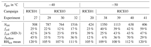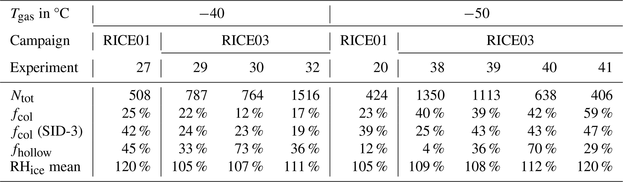 Table 2Results of the analysis of the microscope images of the formvar replicas taken during regrowth phases. Only experiments are analysed where a stable relative humidity during the regrowth phase was achieved. Ntot is the total number of investigated ice particles. fcol is the fraction of identified columnar particles of the total number of particles and fhollow is the fraction of identified hollow columnar particles of all identified columnar particles. fcol (SID-3) is the fraction of columnar particles derived from the SID-3 diffraction patterns during the regrowth phases of the experiments as a comparison.