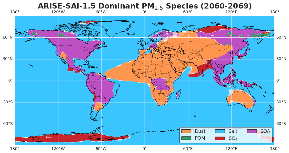 Figure 2Map of the most prevalent PM2.5 species (dust, POM, salt, SO4, SOA and BC) across grid cells, derived from ensemble model averages under the ARISE-SAI-1.5 scenario. Colors represent the dominant species at each location, determined by taking the fraction of the species to the total PM2.5 concentration. Black carbon is not presented here because it does not dominate in any grid cell. White stippling is over areas where fewer than 90 % of ensemble members agree on the dominant species at a grid point.