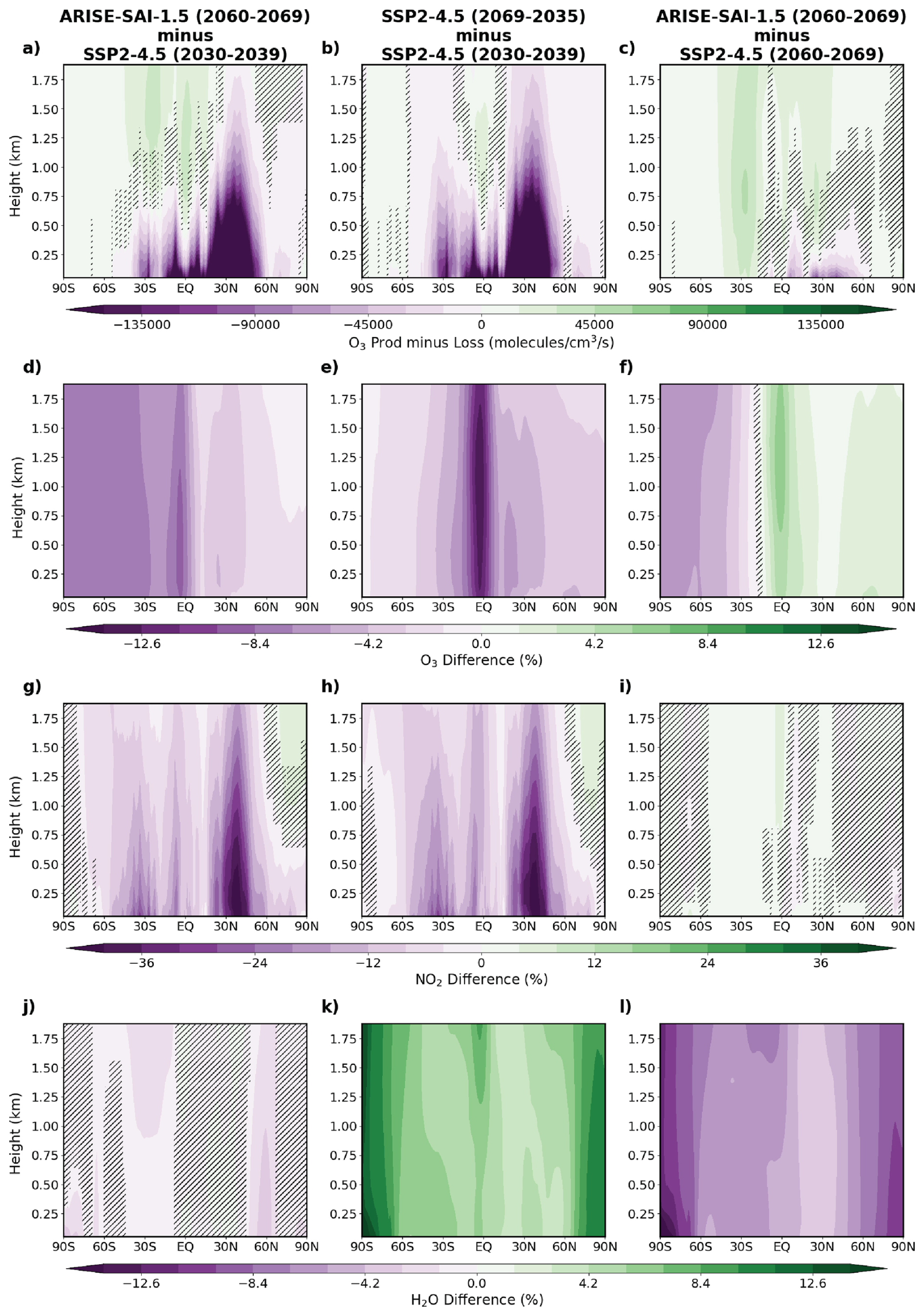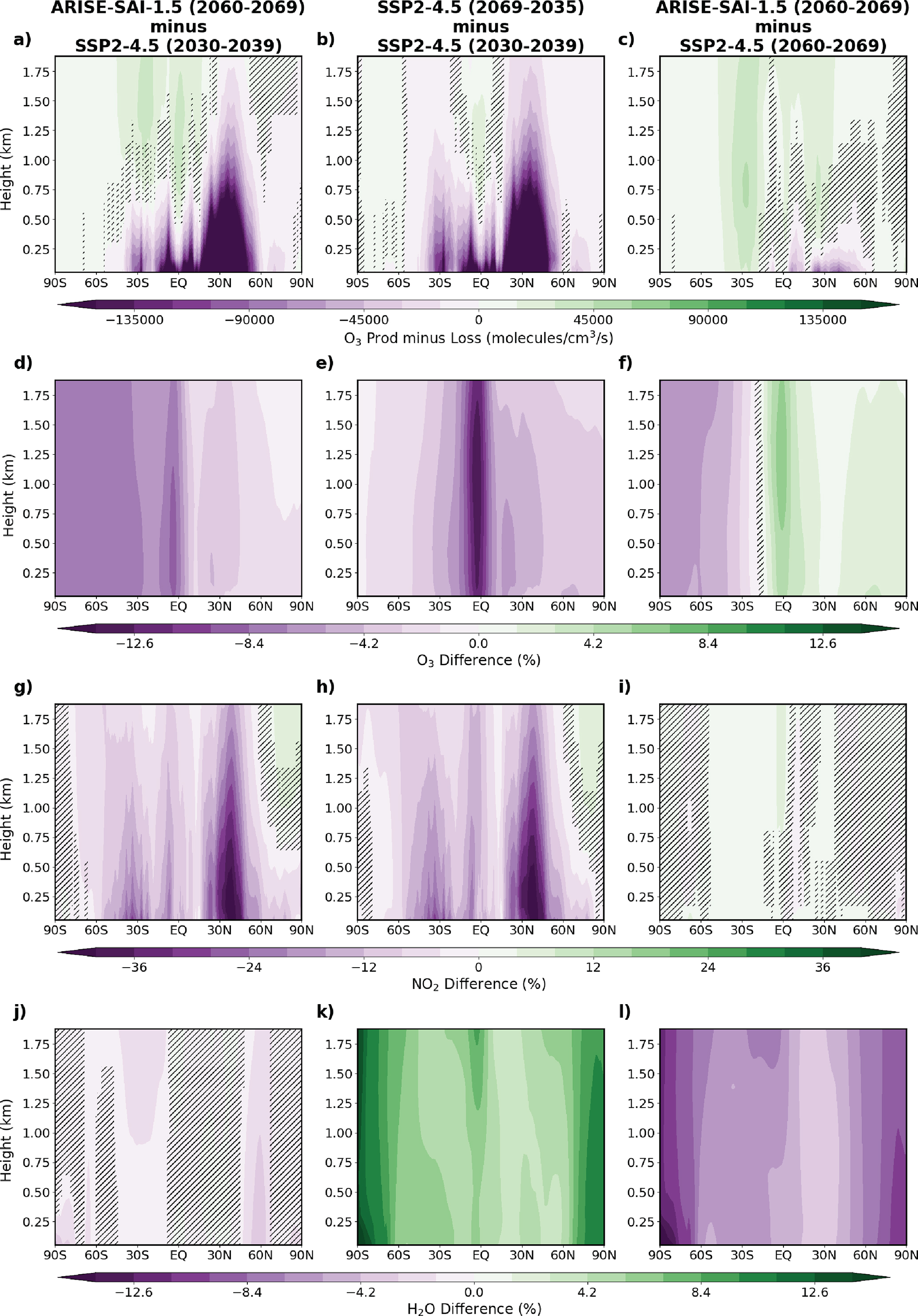 Figure 3Zonal-mean % changes in ozone chemical production minus loss rates, ozone concentrations, and NO2 concentrations under ARISE-SAI-1.5 and SSP2-4.5 scenarios. Panels (a)–(c) show the difference in ozone production minus loss (molecules cm−3 s−1): (a) ARISE-SAI-1.5 (2060–2069) minus SSP2-4.5 (2030–2039), (b) SSP2-4.5 (2060–2069) minus SSP2-4.5 (2030–2039), and (c) ARISE-SAI-1.5 (2060–2069) minus SSP2-4.5 (2060–2069). Panels (d)–(f) show the corresponding % differences in ozone concentrations for the same scenario comparisons. Panels (g)–(i) show % differences in NO2 concentrations, highlighting changes in a key ozone precursor and panels (j)–(l) show % differences in water vapor (H2O) concentrations. The stippling indicates areas where differences between ARISE-SAI-1.5 and SSP2-4.5 are not statistically significant (p > 0.05) based on a t-test performed across all 10 ensemble members.