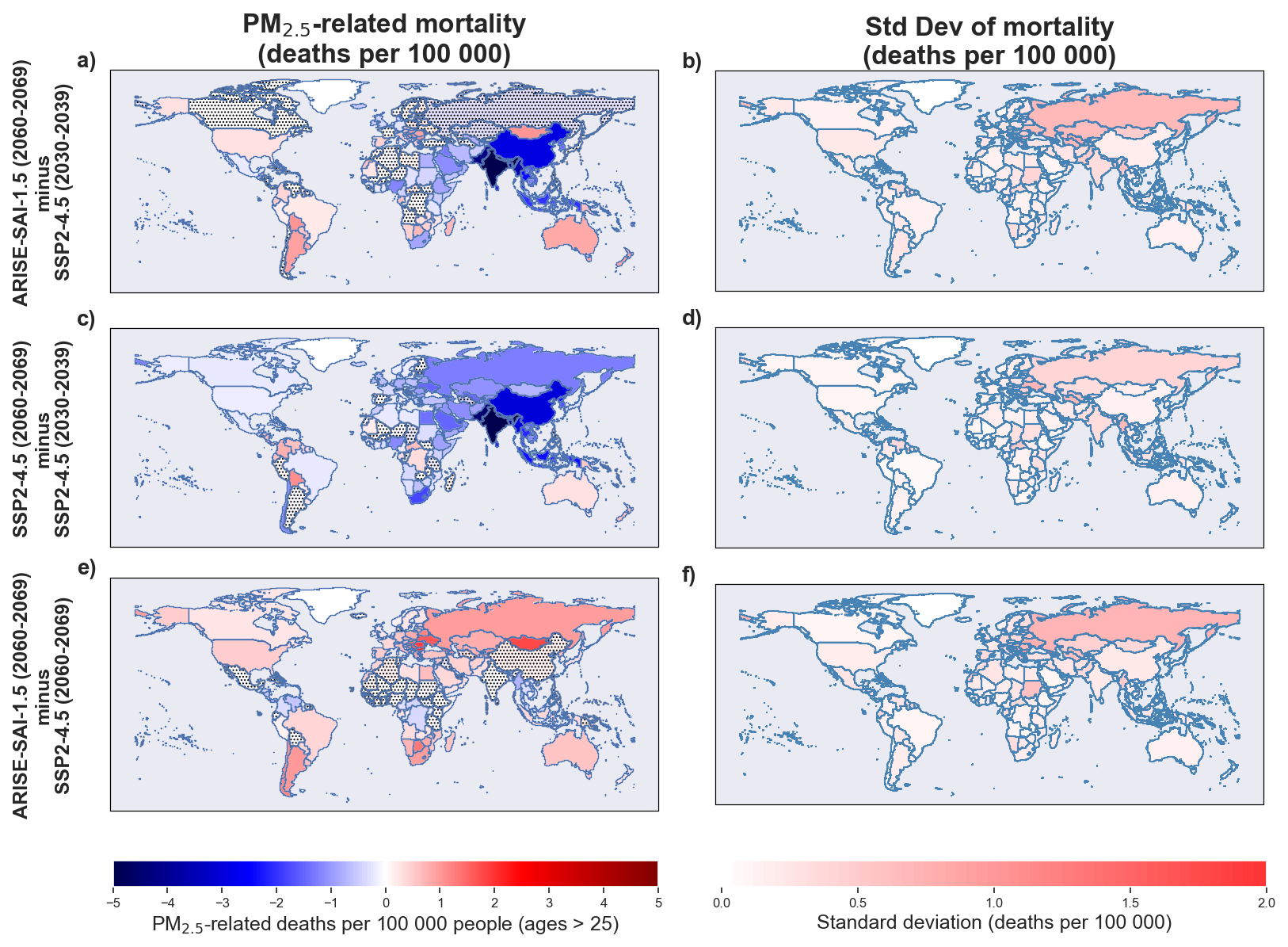 Figure 4Country-level PM2.5-related mortality changes (per 100 000 people) based on ten-member CESM2(WACCM6) ensemble for ages > 25. Each row shows (left) the ensemble-mean mortality change and (right) the inter-ensemble standard deviation. Row (a)–(b) shows ARISE-SAI-1.5 for 2060–2069 relative to SSP2-4.5 for 2030–2039; (c)–(d) shows SSP2-4.5 for 2060–2069 relative to its own 2030–2039 baseline; and (e)–(f) shows the direct effect of SAI by comparing ARISE-SAI-1.5 to SSP2-4.5 for the same 2060–2069 period. Mortality is normalized by national population totals and reported as deaths per 100 000 people (ages > 25). Stippling indicates countries where estimates of the PM2.5-related mortality are not statistically significant across ensemble members at the 95 % confidence level.