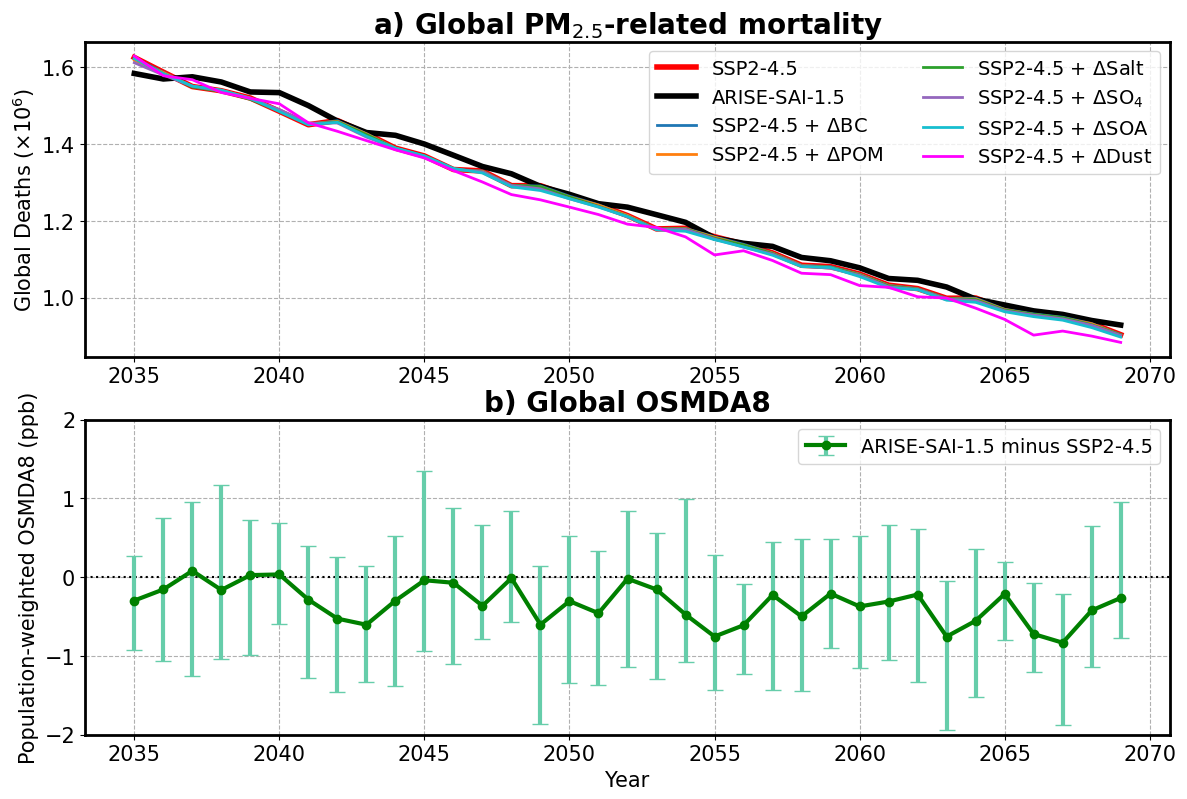 Figure 5(a) Ensemble-averaged global PM2.5-related mortality over time under the SSP2-4.5 and ARISE-SAI-1.5 scenarios, along with sensitivity simulations where changes in individual PM2.5 components (ΔBC, ΔPOM, ΔSalt, ΔSO4, ΔSOA, ΔDust) between ARISE-SAI-1.5 and SSP2-4.5 are added to the SSP2-4.5 baseline. (b) Time series of population-weighted global OSMDA8 differences between ARISE-SAI-1.5 and SSP2-4.5, with error bars indicating ensemble spread.