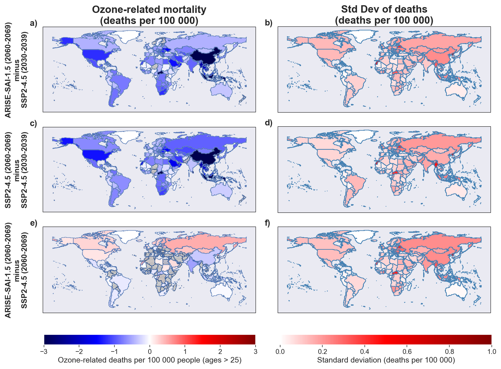 Figure 6Country-level ozone-related mortality changes (per 100 000 people) for ARISE-SAI-1.5 and SSP2-4.5 simulations. Each row shows the ensemble-mean mortality change (left column) and the corresponding inter-ensemble standard deviation (right column) across ten CESM2(WACCM6) ensemble members. Row (a)–(b): ARISE-SAI-1.5 for 2060–2069 relative to SSP2-4.5 for 2030–2039; (c)–(d): SSP2-4.5 for 2060–2069 relative to its own 2030–2039 baseline; (e)–(f): ARISE-SAI-1.5 relative to SSP2-4.5 for the same 2060–2069 period, isolating the direct SAI effect. Mortality values are normalized by total population in each country and expressed in deaths per 100 000 people. Stippling indicates countries where estimates of the ozone-related mortality are not statistically significant across ensemble members at the 95 % confidence level.