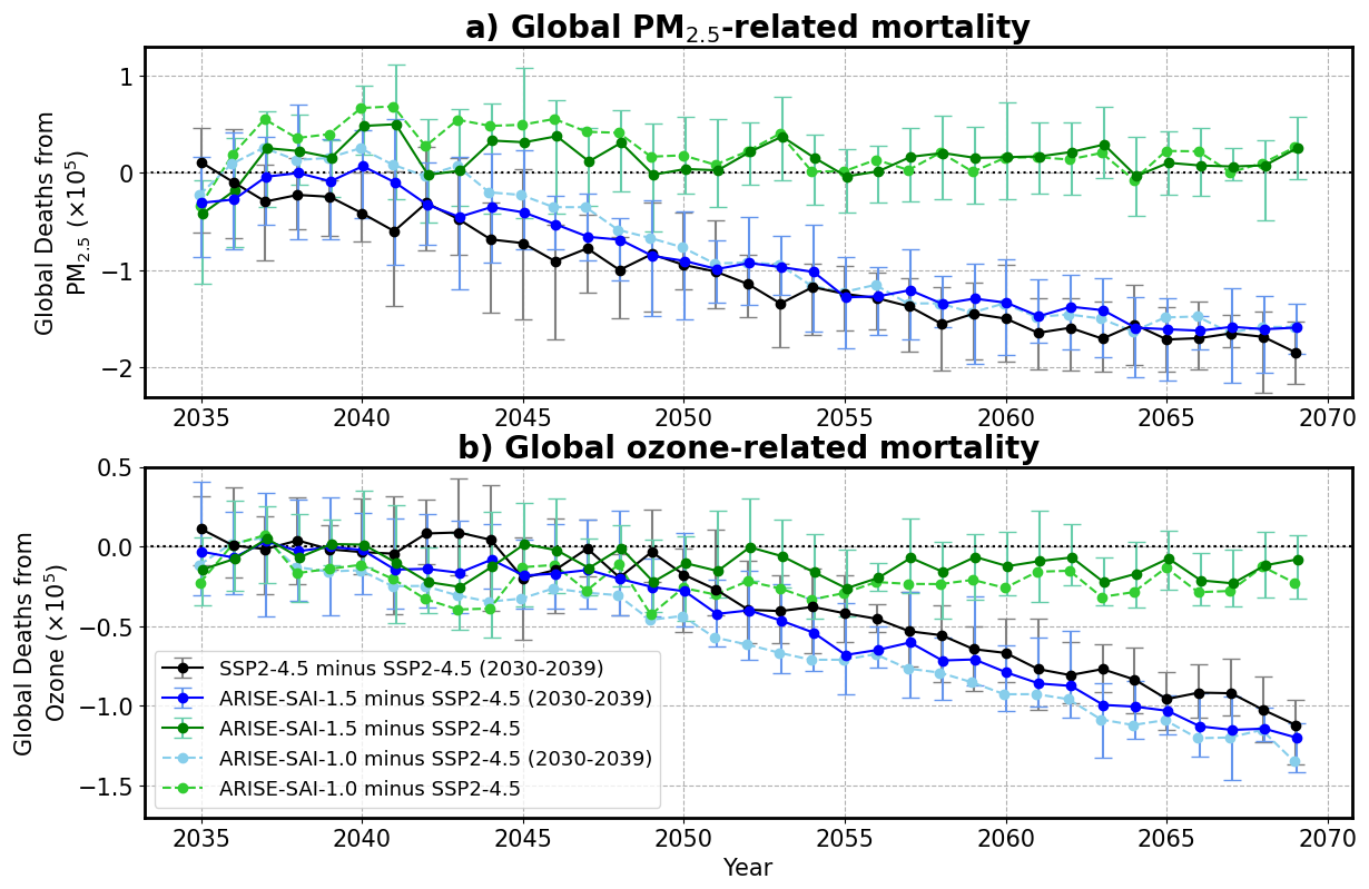 Figure 7Global deaths from (a) PM2.5 and (b) ozone evaluated as (1) ARISE-SAI-1.O minus SSP2-4.5, (2) ARISE-SAI-1.5 minus SSP2-4.5 (2030–2039), (3) ARISE-SAI-1.5 minus SSP2-4.5, (4) SSP2-4.5 minus SSP2-4.5 (2030–2039) and (5) ARISE-SAI-1.5 minus SSP2-4.5 (2030–2039). Error bars represent the full range of outcomes across the model ensemble, showing the minimum and maximum estimates.