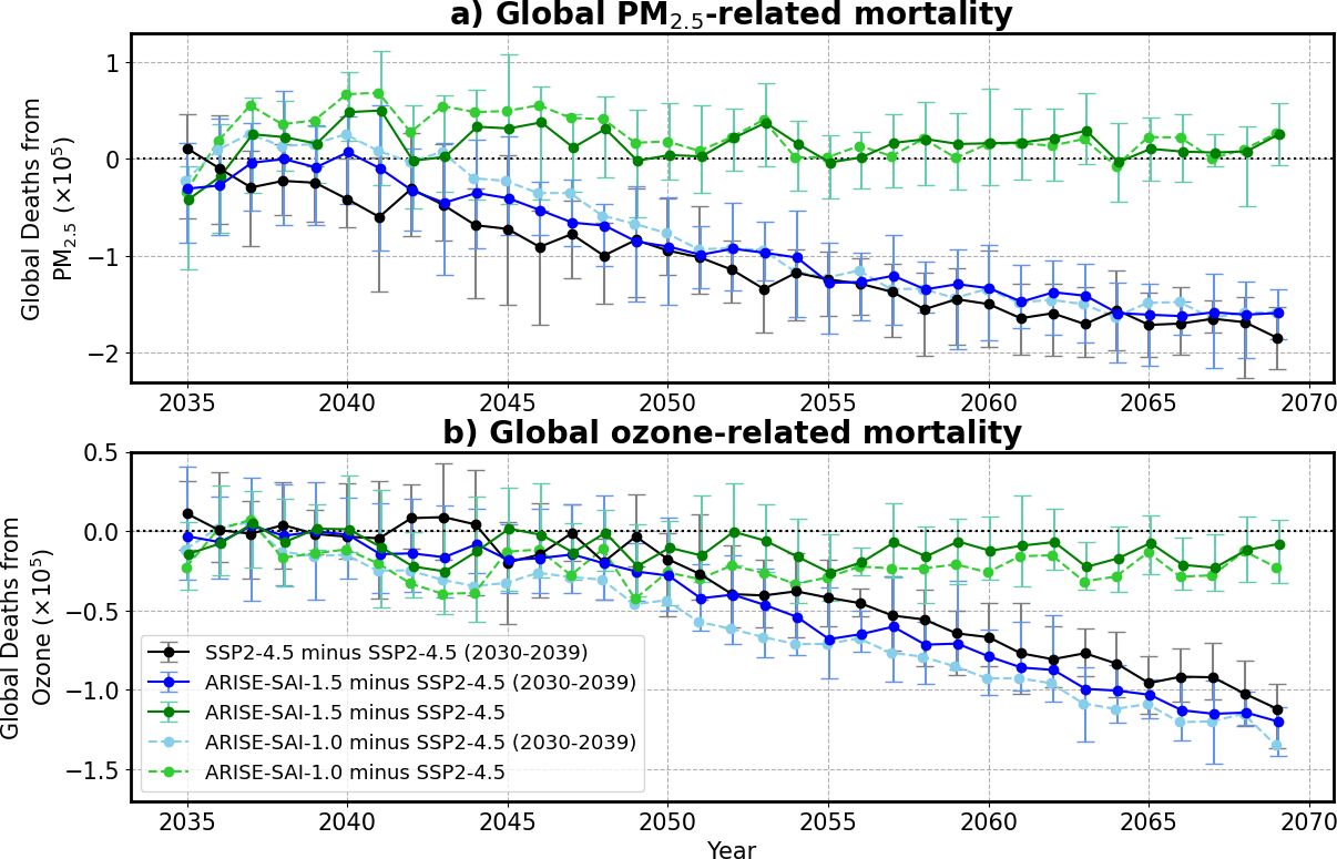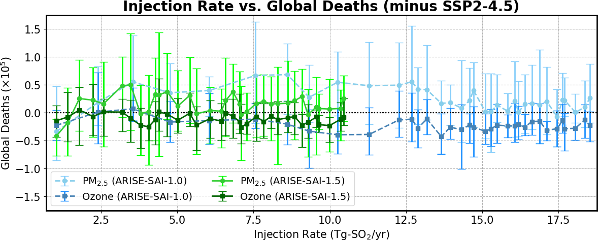 We explore two potential sources of mortality: PM2.5 and surface ozone exposure. PM2.5 is affected both by direct deposition of sulfate from the stratosphere and by climatic conditions affecting other sources of particulates. Tropospheric ozone changes from SAI can be driven by the combination of changes in stratospheric ozone and its transport to the troposphere, and by in-situ changes in tropospheric ozone chemistry driven by SAI-induced changes in surface temperatures and photolysis. The latter are not fully considered in our study, as tropospheric ozone changes caused by direct aerosol impacts on actinic fluxes and photolysis rates are not included (although photolysis rates would still be affected indirectly by aerosol-driven changes to stratospheric ozone column above, and by cloud changes).