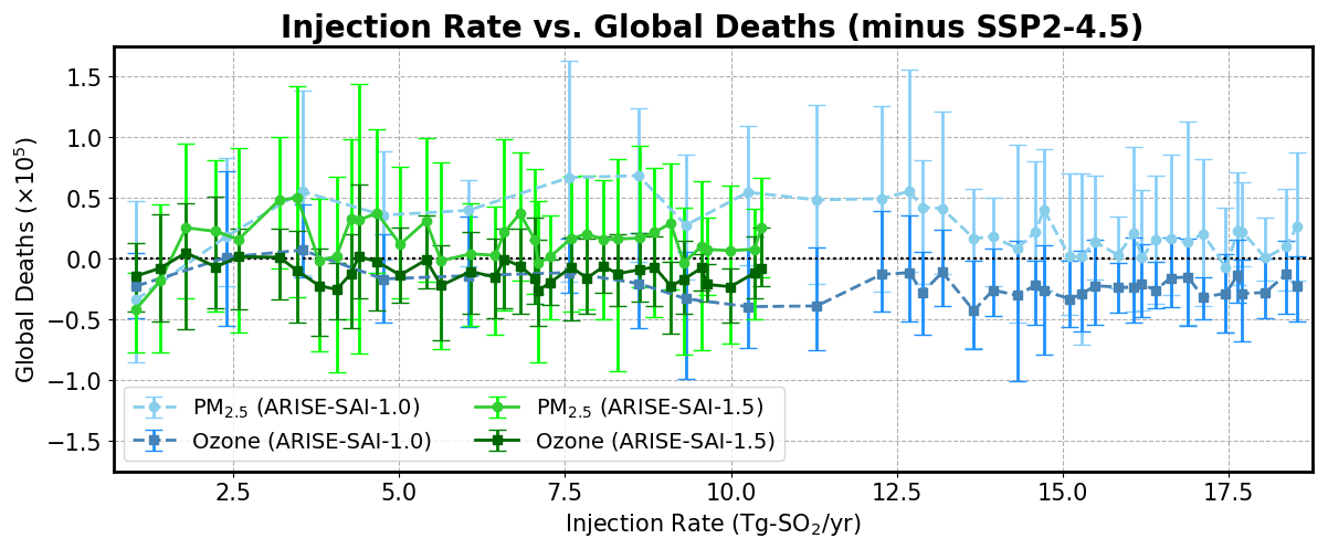 Figure 8Global mortality differences for ARISE-SAI-1.5 minus SSP2-4.5 (shades of green) and ARISE-SAI-1.0 minus SSP2-4.5 (shades of blue) as a function of annual SO2 injection rate (Tg-SO2 yr−1), for PM2.5-related deaths (green) and ozone-related deaths (green). Points represent ensemble means across years (2035–2069), with error bars indicating ensemble variability (±1 standard deviation).