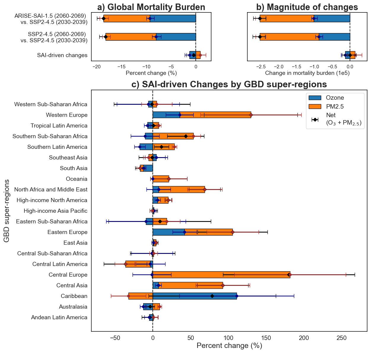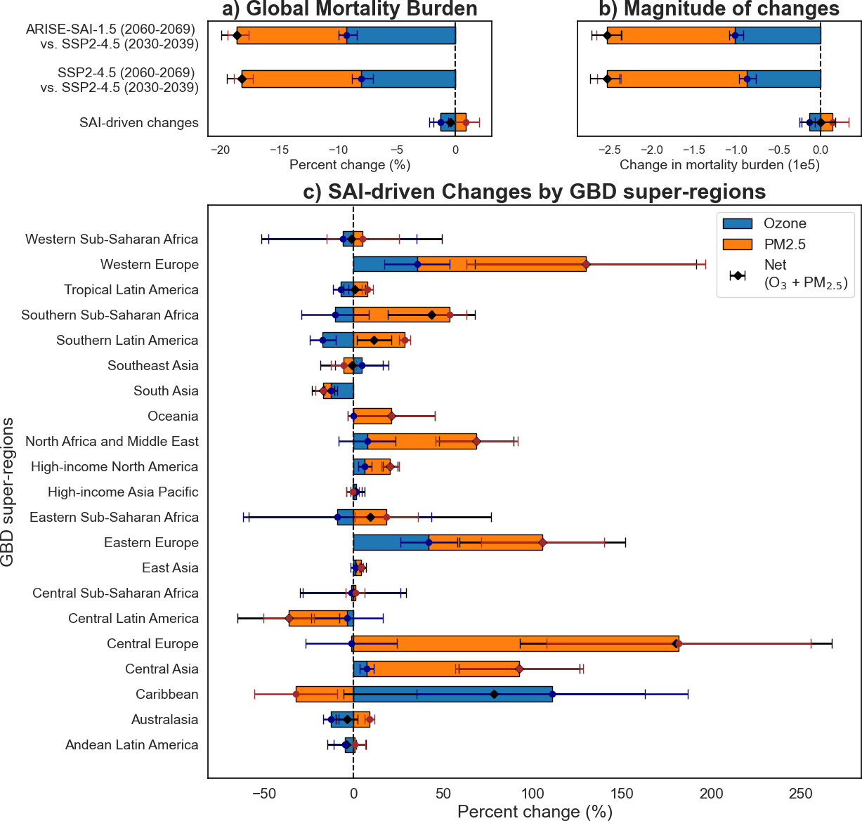 Figure 9(a) Global % change in mortality burden comparing ARISE-SAI-1.5 (2060–2069) and SSP2-4.5 (2030–2039), as well as SSP2-4.5 (2060–2069) and SSP2-4.5 (2030–2039). (b) Absolute global changes in mortality burden (in number of deaths). (c) % change in mortality burden by Global Burden of Disease (GBD) super-region between ARISE-SAI-1.5 (2060–2069) and SSP2-4.5 (2060–2069). % changes are calculated relative to baseline mortality rates. Positive values indicate an increase in mortality relative to the baseline, while negative values indicate reductions. Bars represent stacked contributions from ozone-related deaths (blue) and PM2.5-related deaths (orange), with horizontal error bars indicating the ensemble spread (standard deviation) for each component and for the net total (black diamonds with error bars).