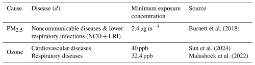 where X represents the spatially and temporally resolved grid-cell level OSMDA8; Xmin represents the theoretical minimum risk exposure concentration and β represents a model-parameterized slope of the log-linear relationship between concentration and health from epidemiological studies. For chronic respiratory disease mortality, we apply a β of ln(1.06) per 10 ppb ozone (95 % confidence interval (CI) 1.03–1.10) derived by GBD 2019 (Jerrett et al., 2009; Malashock et al., 2022; GBD 2021 Risk Factors Collaborators, 2020). For cardiovascular disease mortality, we apply a β of ln(1.028) per 10 ppb ozone (95 % CI 1.010–1.047) (Sun et al., 2024). A summary of the RR and disease d used to calculate mortality associated with PM2.5 and ozone is provided in Table 1. For more detail, Fig. S1 in the Supplement shows how AF changes with increasing PM2.5 and ozone concentrations.