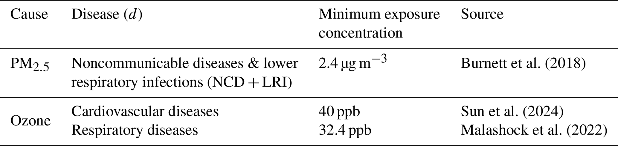 Burnett et al. (2018)Sun et al. (2024)Malashock et al. (2022)Table 1Summary of risk functions used for estimating attributable mortality. Minimum exposure concentrations correspond to the theoretical minimum risk exposure levels for each pollutant-health outcome pair.