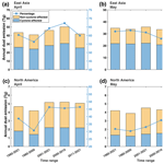 Figure 10Regime shifts in extratropical cyclone-affected dust emissions (Tg) across East Asia and North America during April and May for multiple subperiods within 1980–2021. The annual average dust emissions (Tg) along the passage of extratropical cyclones (blue bars) and those unaffected by them (yellow bars) are shown for (a, b) East Asia and (c, d) North America in (a, c) April and (b, d) May, for the time periods: 1980–2021, 1980–2000, 2001–2021, 2000–2010, and 2011–2021, with reference to the left y axis. The blue bars show the cyclone-affected dust emissions, defined as the difference between total dust emissions and the emissions in the cyclone-controlled experiments (i.e., total – cyclone-controlled), while the yellow bars show the emissions estimated from the cyclone-controlled experiments. The blue solid line represents the percentage of dust emissions affected by extratropical cyclones (%) over these periods, corresponding to the right y axis.