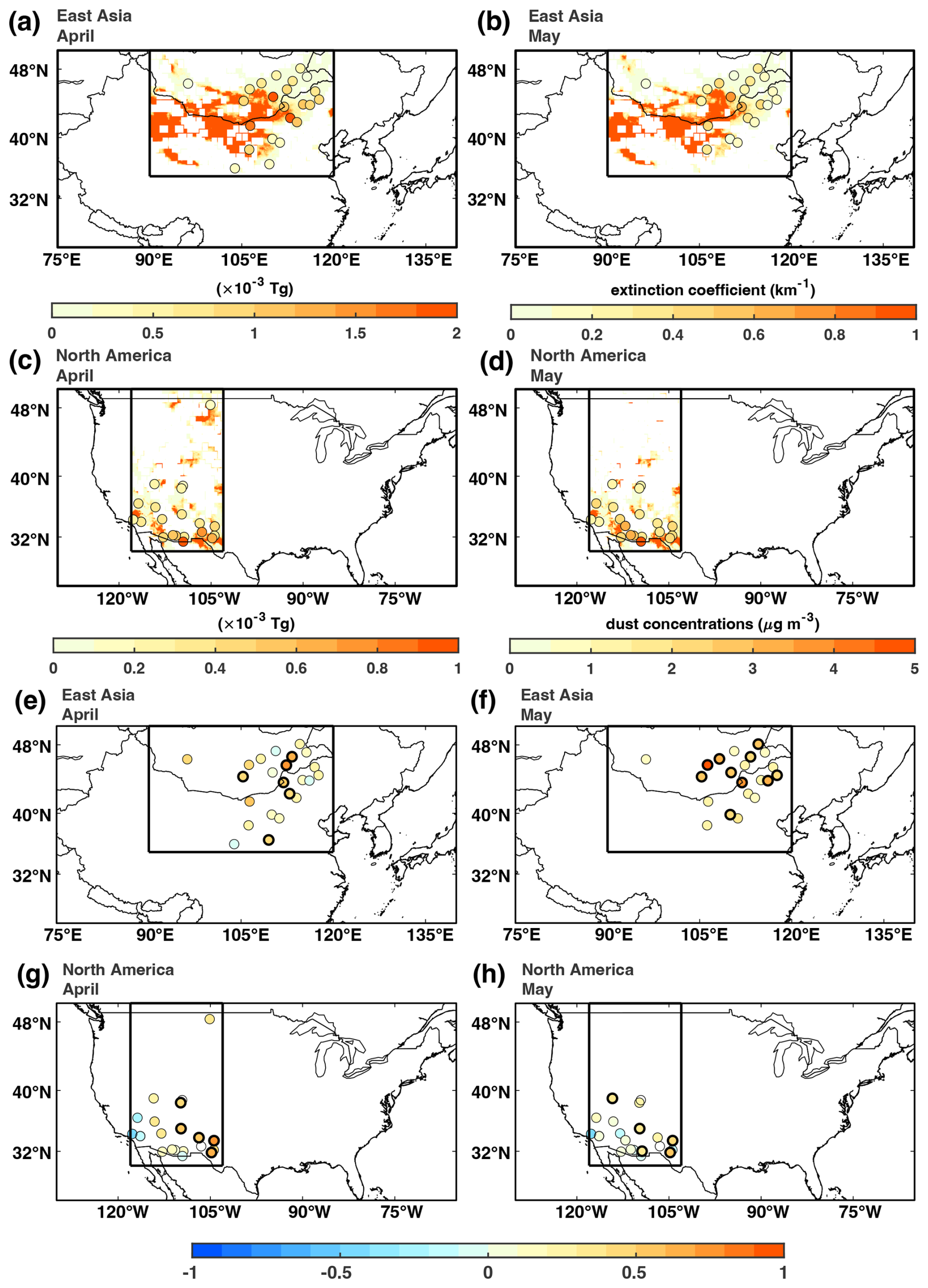 To assess the reliability of the off-line dust emission model over East Asia and North America during April and May, spatial distributions and temporal correlations between simulated dust emissions and ground-based observations of dust abundance over the past four decades are evaluated (Fig. 1). The simulated dust emission patterns geographically align with ground-observed dust abundance for both regions and seasons (Fig. 1a–d). Statistically significant positive correlations are widely obtained across both regions, especially over areas close to the dust sources (Fig. 1e–h). These results indicate that this model successfully captures the spatial and temporal patterns of observed dustiness.