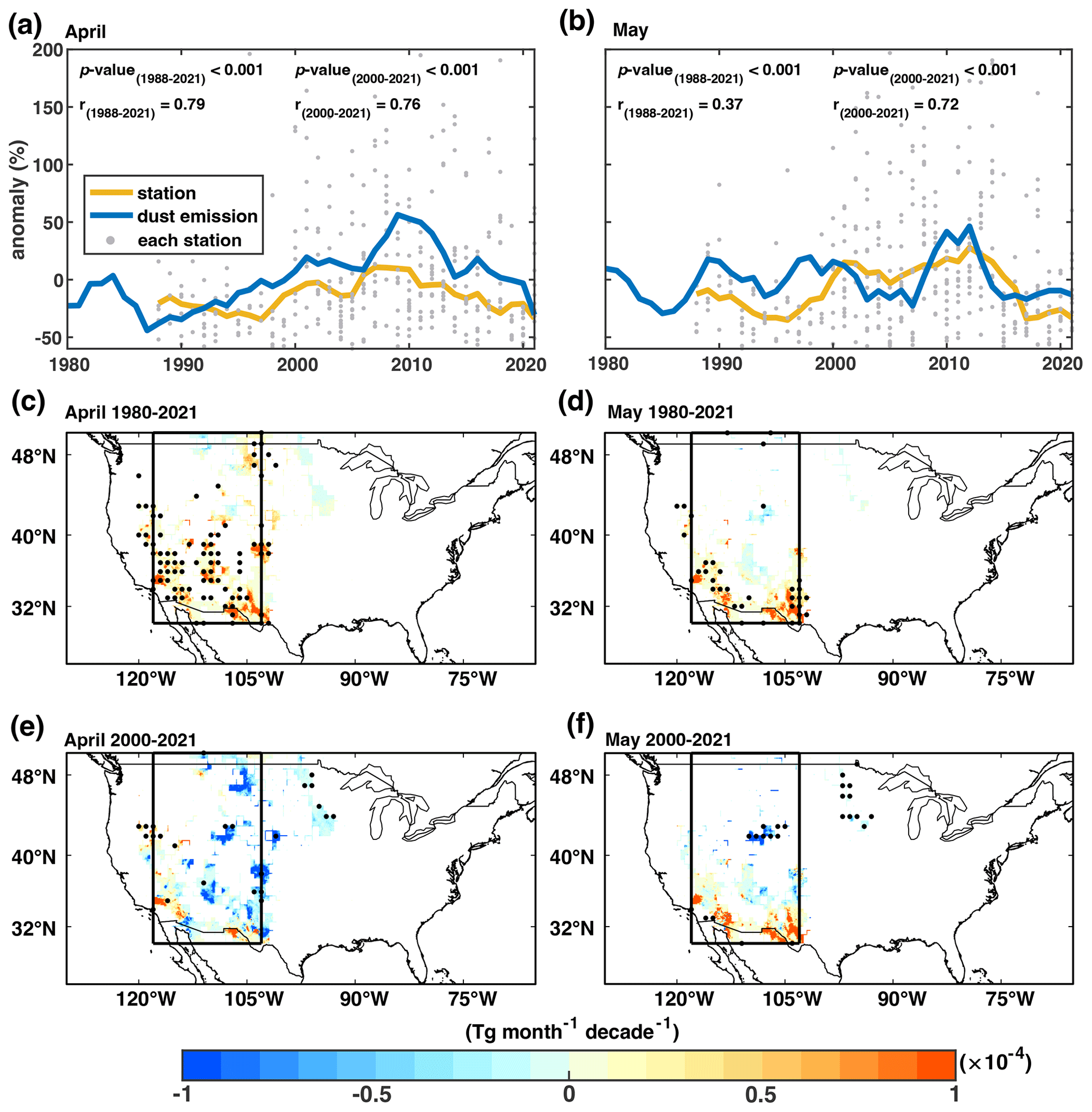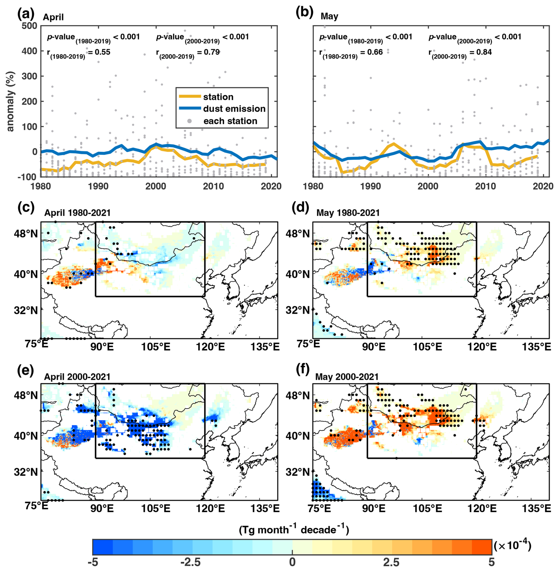In contrast, both East Asian and North American dust emissions show a consistent upward trend in May during the past four decades. The East Asian dust emission in May is estimated to have increased significantly (p values < 0.05) by 0.937 Tg per month per decade or 5.67 % during 1980–2021; this increase accelerates to 6.22 Tg per month per decade or 11.2 % for the period 2000–2021 (Fig. 2b, d and f). This trend is supported by significant (p values < 0.001) positive correlations with station-based observations, with correlation coefficients of 0.66 and 0.84 during past four to two decades (Fig. 2b). In North America, the regional total dust emission has increased significantly (p values < 0.1) by 0.275 and 0.184 Tg per month per decade or 16.3 % and 12.0 % in May during 1980–2021 and 2000–2021 (Fig. 3b, d and f), respectively, consistent with the ground-based dustiness observations, which exhibit a significant positive correlation (p values < 0.001) (Fig. 3b).