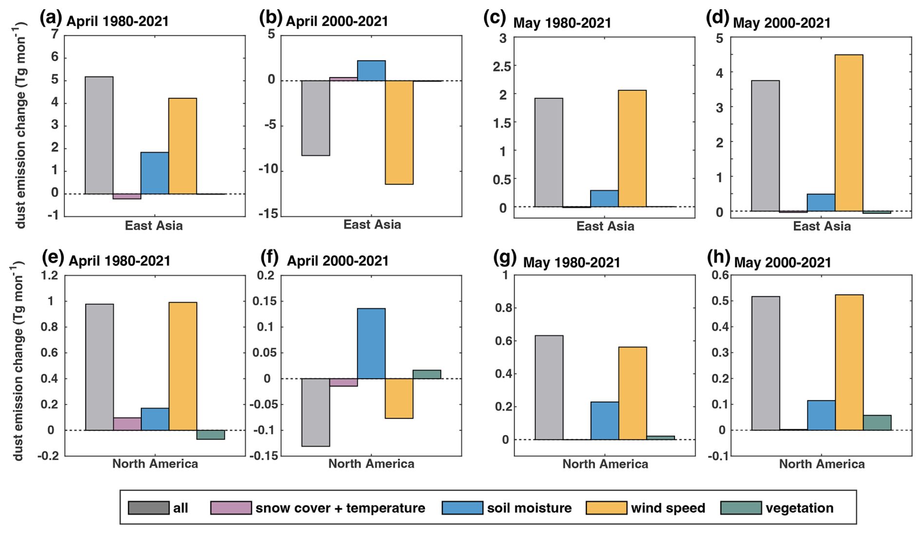 The contributions of several environmental variables to the decadal variations in regional dust emissions are disentangled by the sensitivity experiments. The multidecadal change in East Asian and North American springtime dust emissions during 1980–2021 have been mainly driven by variations in surface wind speed (Fig. 4a). For example, during 1980–2021, the changes in surface wind speed have made a positive contribution to dust emission increase by 10.3 % and 23.7 % across East Asia and North America, respectively, in April (Fig. 4a and e), and a corresponding regional contribution of 6.09 % and 14.5 % in May (Fig. 4c and g). During 2000 to 2021, the surface wind speed has caused a reduction in dust emissions by 22.9 % and 1.48 % across East Asia and North America in April (Fig. 4b and f) and an increment by 13.4 % and 12.2 % in May (Fig. 4d and h). As the dominant influencing factor of East Asian and North American dust emission in mid-to-late spring, near-surface wind speed shows spatio-temporally in-phase variations with dust emission. Spatially, daily maximum wind speed (Fig. 5) exhibits similar patterns of change with those in dust emissions across both regions during both the shorter and longer periods (Figs. 2 and 3).