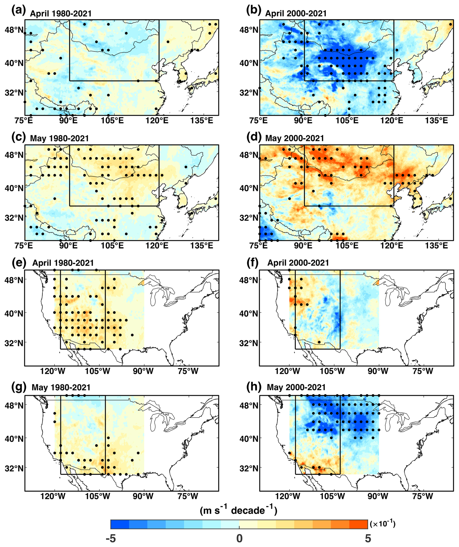 Figure 5Changes in daily maximum wind speed in April and May for the period 1980–2021 and 2000–2021. Trends in (a, b) April and (c, d) May daily maximum wind speed (m s−1 per decade) across East Asia for the period (a, c) 1980–2021 and (b, d) 2000–2021. Trends in (e, f) April and (g, h) May daily maximum wind speed (m s−1 per decade) across North America for the period (e, g) 1980–2021 and (f, h) 2000–2021, respectively. Black dots indicate significant (p values < 0.1, based on the Mann–Kendall trend test) trend.
