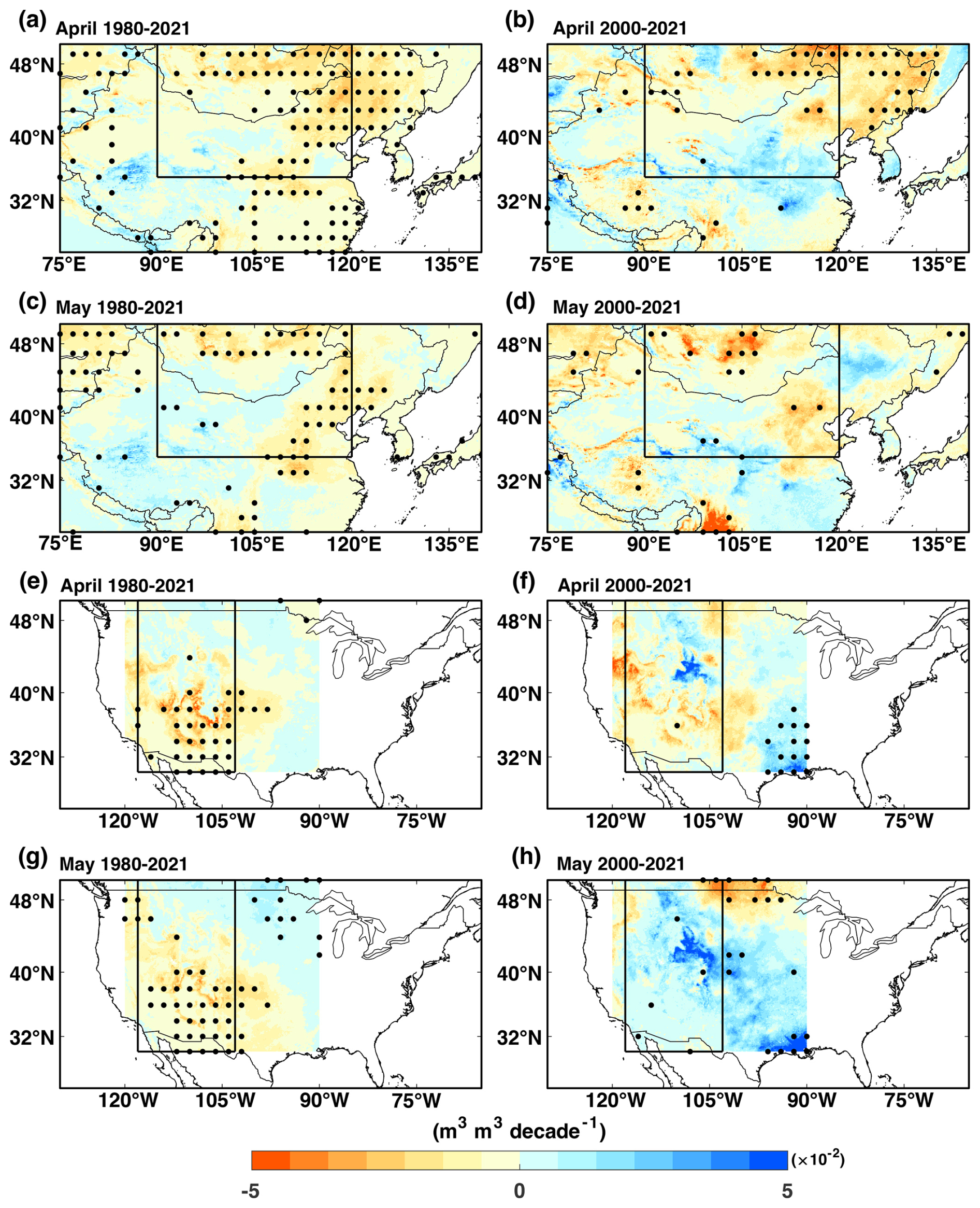Figure 6Changes in top-layer soil moisture in April and May for the period 1980–2021 and 2000–2021. Trends in (a, b) April and (c, d) May soil moisture (m3 m−3 per decade) across East Asia for the period (a, c) 1980–2021 and (b, d) 2000–2021. Trends in (e, f) April and (g, h) May daily soil moisture (m3 m−3 per decade) across North America for the period (e, g) 1980–2021 and (f, h) 2000–2021, respectively. Black dots indicate significant (p values < 0.1, based on the Mann–Kendall trend test) trend.