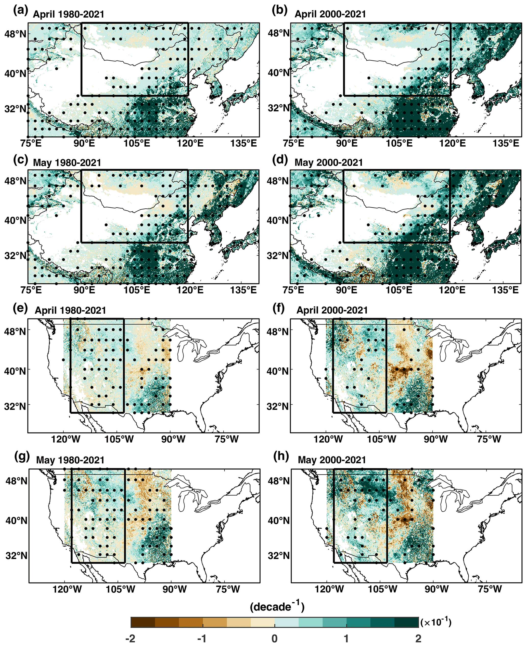 Figure 7Changes in LAI in April and May for the period 1980–2021 and 2000–2021. Trends in (a, b) April and (c, d) May LAI (per decade) across East Asia for the period (a, c) 1980–2021 and (b, d) 2000–2021. Trends in (e, f) April and (g, h) May daily LAI (per decade) across North America for the period (e, g) 1980–2021 and (f, h) 2000–2021, respectively. Black dots indicate significant (p values < 0.1, based on the Mann–Kendall trend test) trend.