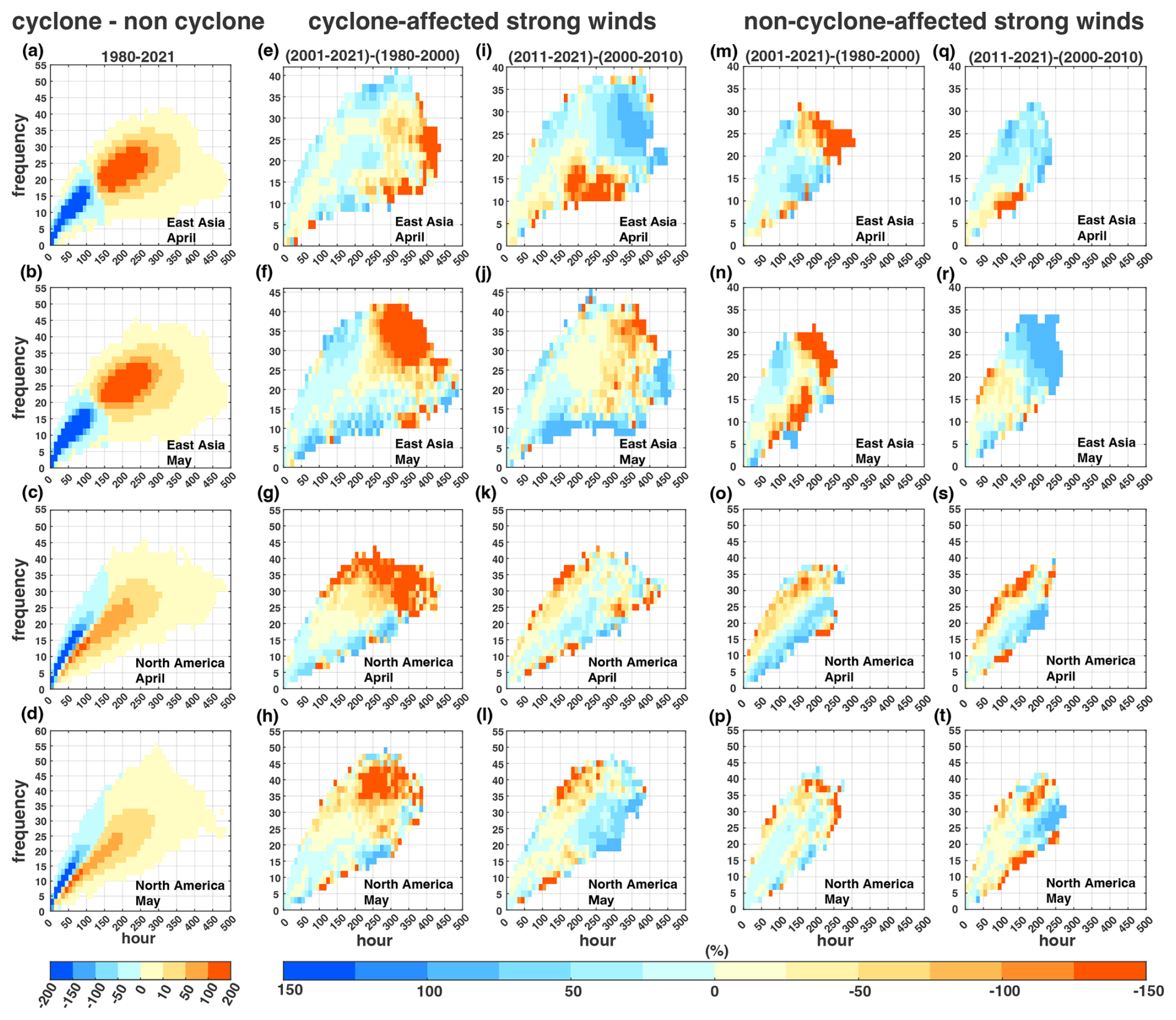 Figure 8Changes in cyclone-affected strong wind across East Asia and North America in April and May. Joint probability distribution of monthly differences in total frequency and duration of cyclone-affected strong winds, subtracted by non-cyclone-affected strong winds, across the dust-emitting pixels in (a, b) East Asia and (c, d) North America in (a, c) April and (b, d) May during 1980–2021. Change rate (%) of the joint PDF of the frequency (events per month) and duration (hours per month) of cyclone-affected strong winds (>6 m s−1) to baseline periods from ERA5 hourly 10 m wind speed data across the dust-emitting pixels in (e, f, i, j) East Asia in (e, i) April and (f, j) May for the period (e, f) 1980–2021, (i, j) 2000–2021 and in (g, h, k, l) North America in (g, k) April and (h, l) May for the period (g, h) 1980–2021, (k, l) 2000–2021. (m–t) Same as (e)–(l) but for non-cyclone-affected strong winds.