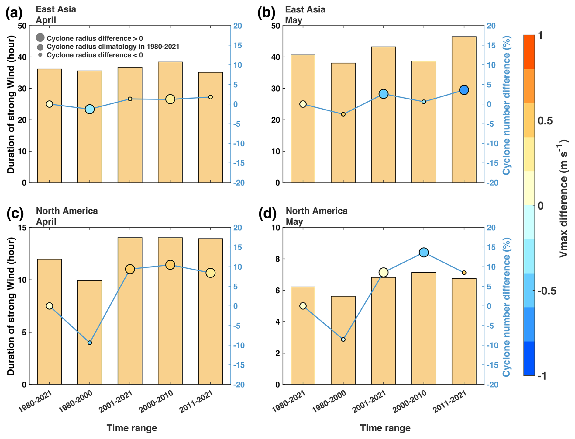 Figure 9Regime shifts in extratropical cyclones across East Asia and North America during April and May across different time periods from 1980 to 2021. The monthly average duration of strong winds (hours; yellow bars) caused by extratropical cyclones in (a, b) East Asia and (c, d) North America in (a, c) April and (b, d) May, for the time periods: 1980–2021, 1980–2000, 2001–2021, 2000–2010, and 2011–2021, with reference to the left y axis. The blue solid line with markers represents the difference in the monthly average number of cyclones during these periods compared to the monthly average cyclone count during the whole period 1980–2021, corresponding to the right blue y axis. Marker color shows the deviation of monthly mean Vmax (m s−1) from the 1980–2021 climatology, and marker size reflects the cyclone radius difference relative to the 1980–2021 mean.