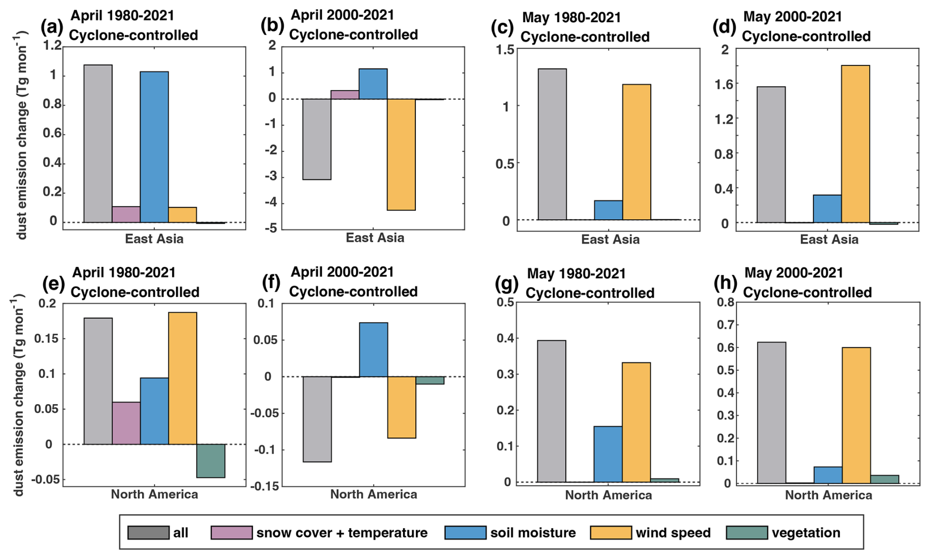 Based on the cyclone-controlled sensitivity experiments (Sect. 2.7), we further quantify the influence of extratropical cyclones on the decadal variability of dust emissions in April and May. After constraining the cyclone-affected wind speed to its climatological state, the decadal variability of dust emissions shows substantial changes, accompanied by a shift in the dominant environmental drivers (Fig. 11). Specifically, the magnitude of dust emission changes across both East Asia and North America is markedly reduced over the past two to four decades. The increase in East Asian dust emissions over 1980–2021 declines from 5.18 to 1.08 Tg in April, representing a reduction of 79.2 % (Figs. 4a and 11a). Similarly, in North America, the April dust emission increment over same period is reduced from 0.978 to 0.179 Tg, corresponding to a reduction of 81.7 % (Figs. 4e and 11e). In May of these four decades, nudging the cyclone-affected strong winds to their climatology leads to a reduction of 31.3 % and 37.8 % in the decadal changes of East Asian and North American dust emission. During 2000–2021, such contribution of ECs to dust emission shrinks to 62.7 % and 58.4 % for East Asia in April and May and becomes negligible for North America in both months.
