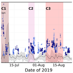 Figure 2 shows the hourly AOD values at 500 nm (AOD500) recorded in and around Svalbard from June to September 2019. The mean daily AOD500 values calculated considering all the available period (2002–2020) are included as reference (see dashed line in Fig. 2). It can be seen that most of the summer of 2019 (considered from June to September for this study, if nothing else is specified) presented consistently higher values of AOD with respect to past and following years (2002 to 2020 period). AOD500 in 2019 was similar to the reference values during June, but since 6 July, when an unprecedented increase in AOD occurred, it remained high for the rest of the summer. The median AOD500 from July to September for the 2002–2020 reference period is 0.048, but this value is 0.162 when it is calculated only with 2019 data; it means that AOD500 in this period was more than three times higher than during the reference. Regarding the AE, which is related to the size of the aerosol, it did not show a significant difference with respect to the reference period as can be observed in Fig. S2 in the Supplement. The days on which the AOD500 values were higher than the summer average plus three times the standard deviation have been identified as days when an aerosol intrusion was occurring in Svalbard. This way, three different aerosol events have been identified during the summer of 2019 in the following periods: 6 to 10 July, 25 to 28 July and 6 to 17 August, which have been named C1, C2 and C3 respectively because they are observed in the atmospheric column (C). During these three events the mean AOD500 values were 0.28, 0.19 and 0.23 respectively. Moreover, the periods between C1 and C2, and between C2 and C3 presented mean AOD500 values of 0.15 and 0.17 respectively; this mean value was 0.15 from the end of event C3 (17 August) to the end of August. Finally, during September the mean AOD500 was 0.11.
