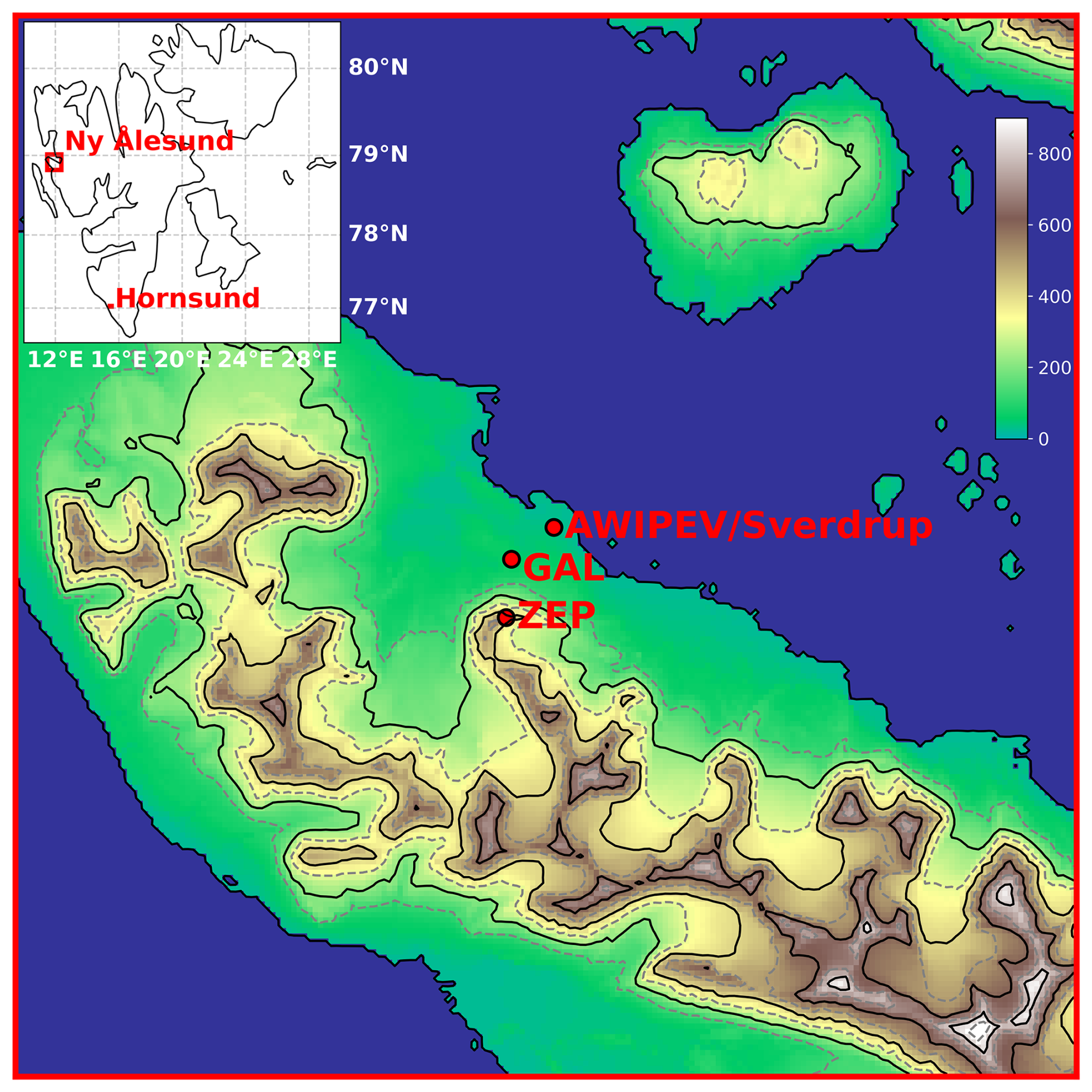 Figure 1Topographic map of the vicinity of Ny-Ålesund and its location on Svalbard. The main stations used for the study have been located in the map: Zeppelin Observatory (ZEP), Gruvebadet Atmospheric Laboratory (GAL), AWIPEV and Sverdrup. The colors indicate the altitude; blue indicates water surface. Map created using the dataset by Moholdt et al. (2019).