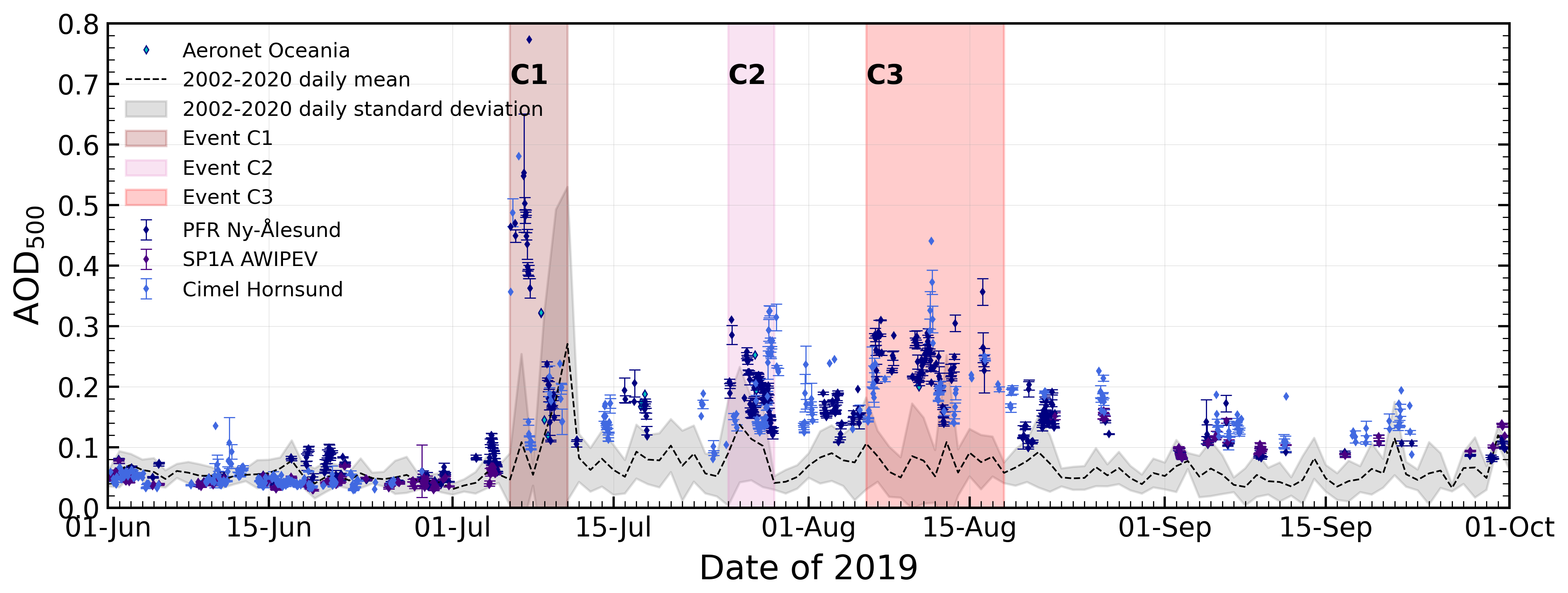 Figure 2Aerosol Optical Depth (AOD) temporal evolution (hourly means with standard deviation) in and around Svalbard in the summer of 2019 (June to September), with data from Ny-Ålesund, Hornsund and R/V OCEANIA (in the Fram Strait). The time periods highlighted in dark red, pink and red shaded areas correspond to the three events identified as aerosol events in the column, respectively: 6–10 July (C1), 25–28 July (C2) and 6–17 August (C3). The scatter points with error bars represent hourly mean values and their associated standard deviation. The black dashed line represents the mean daily values of AOD at 500 nm calculated with all the available measurements on the reference period, i.e. from 2002 to 2020; the grey shaded area represents the corresponding standard deviation. The high reference values observed on 10 and 11 July are due to an extreme event that occurred in 2015.