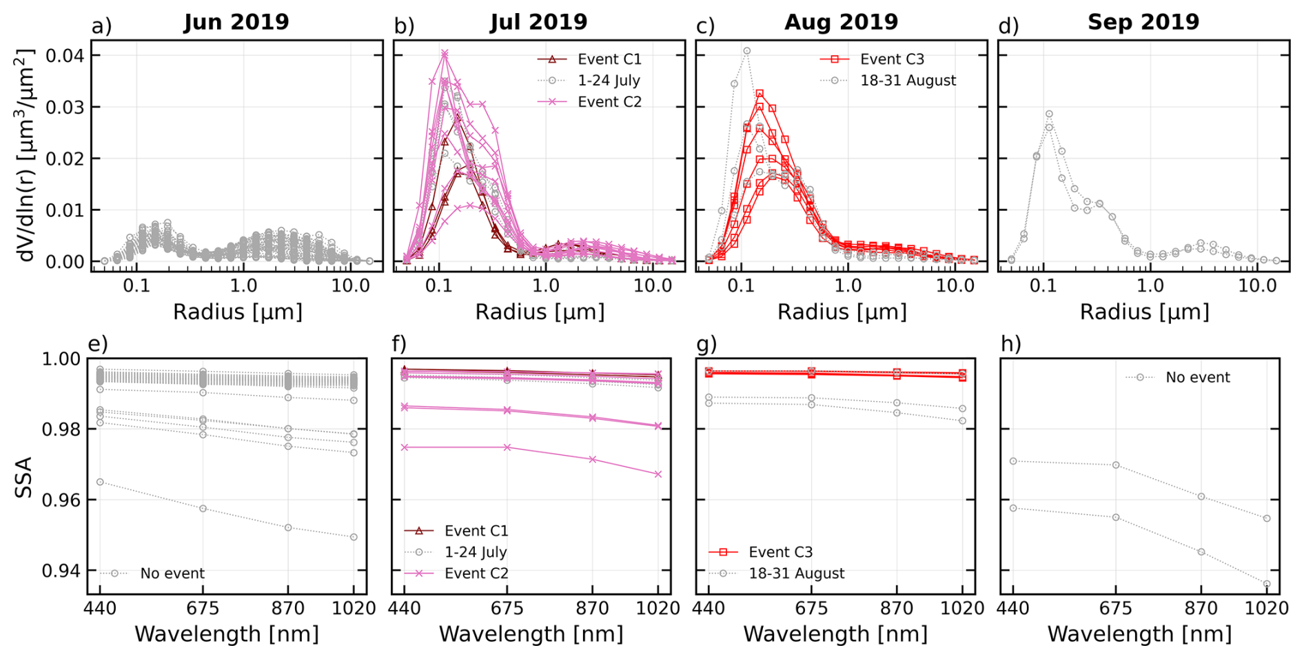 The columnar PVSD and SSA values retrieved for the analyzed period are shown in Fig. 3, highlightening those corresponding to the identified events. Table 2 summarizes the mean AOD and mean parameters of the PVSD, observed during the periods identified with aerosol event, and also in the adjacent periods during summer 2019. Figure 3a–d show a high aerosol concentration in fine mode (Accumulation mode) during July and August; this also happens for September, when no aerosol events have been identified. Aitken mode and coarse mode particles are almost absent; the highest variability in PVSD during this summer is observed in the Accumulation mode, when the maximum volume concentrations of the PVSD oscillate from 0.01 to 0.04 µm3 µm−2 in all the period.