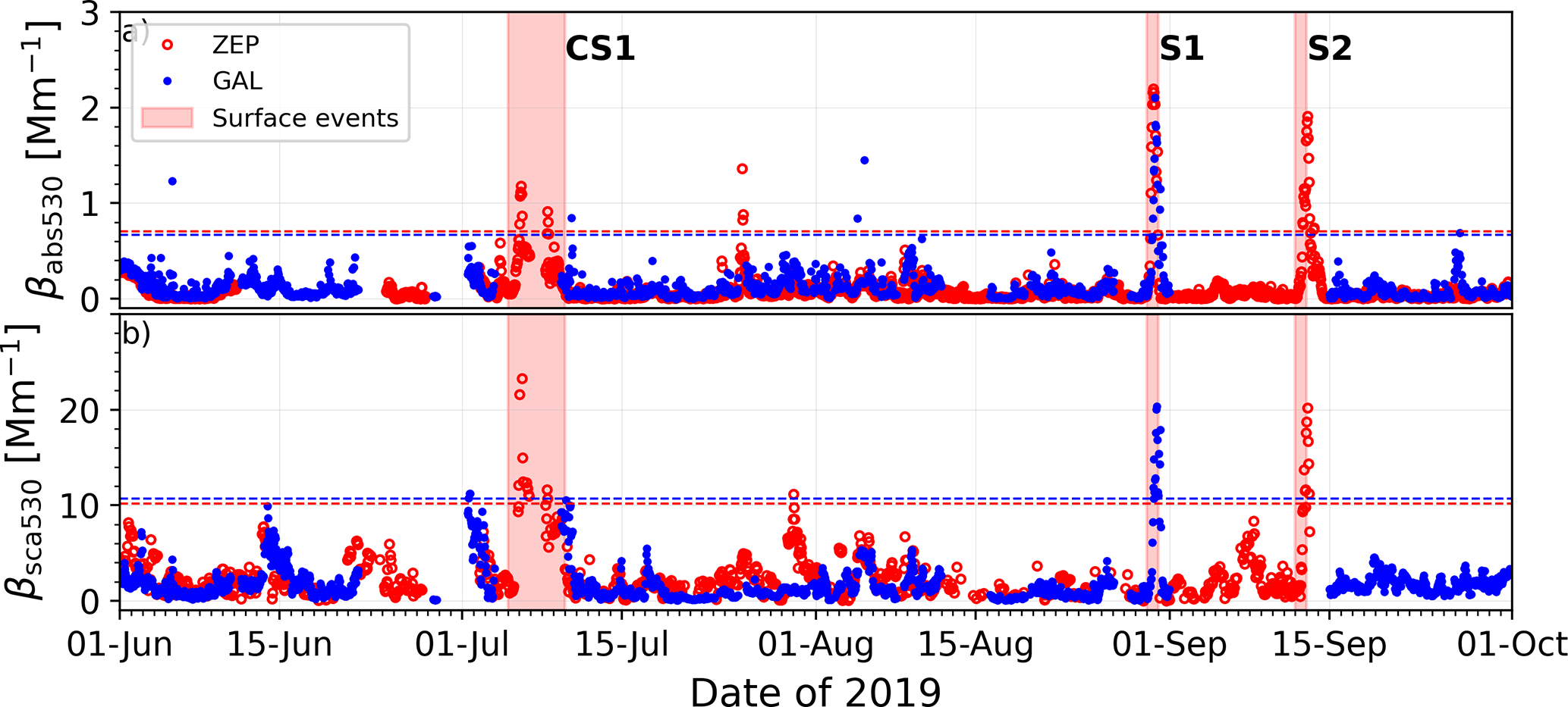 Figure 4Time series of (a) aerosol absorption coefficient (βabs) and (b) scattering coefficient (βsca) at 530 nm at Gruvebadet (GAL), in blue, and Zeppelin (ZEP), in red. The horizontal lines correspond to the average of the logarithm of scattering and absorption coefficients over three summers (2018–2020, from June to September) plus three times the standard deviation (in blue for GAL and in red for ZEP) used to identify aerosol events. The time periods with red shaded areas correspond to the three events identified as high aerosol load in the surface: 5 to 9 July (CS1), 30 August (S1), and 12 September (S2).